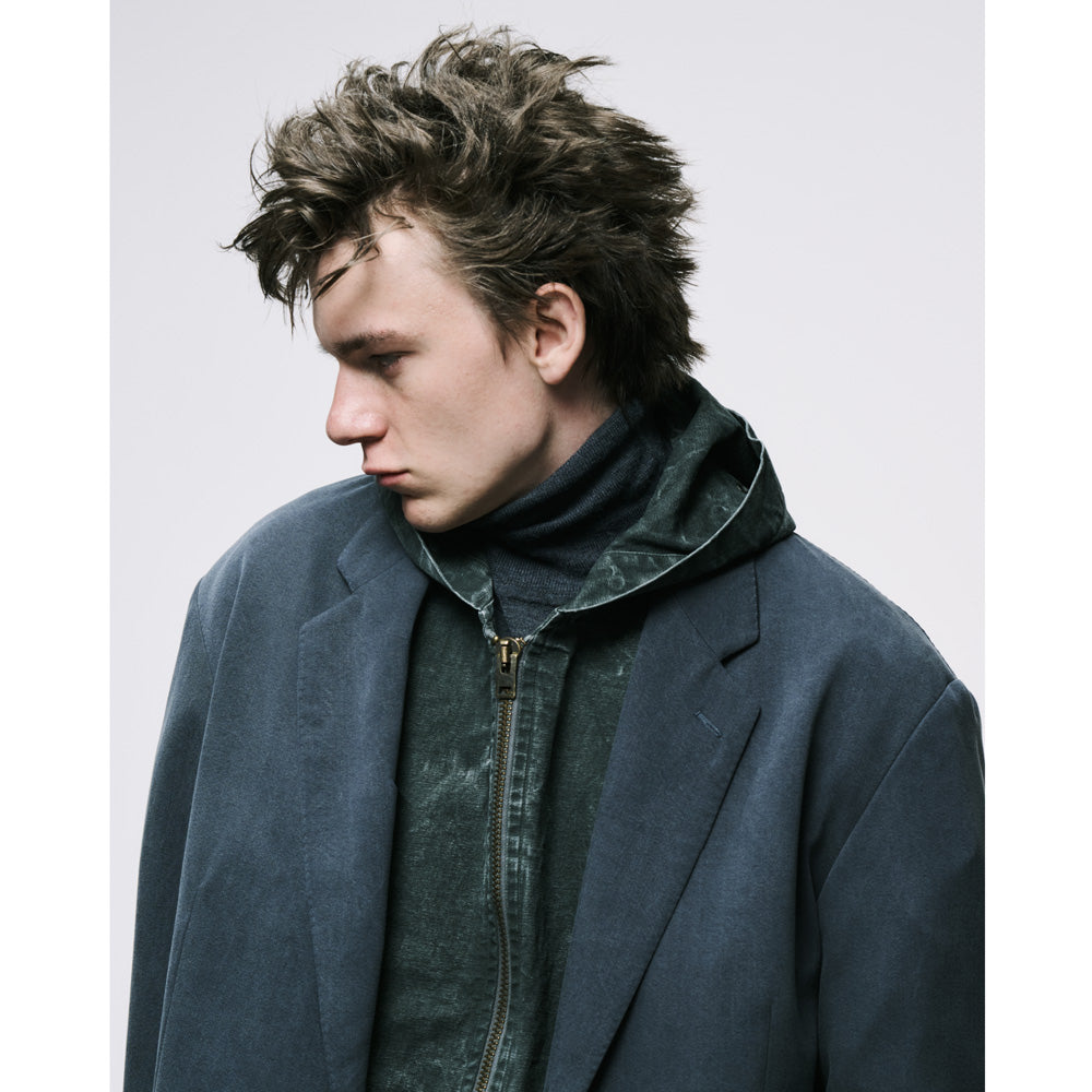 The shoulders are sloping, and the sleeves are natural shoulders.