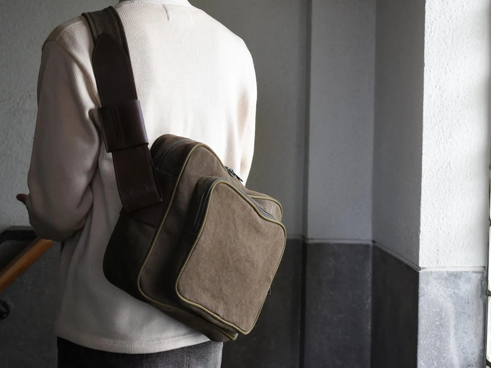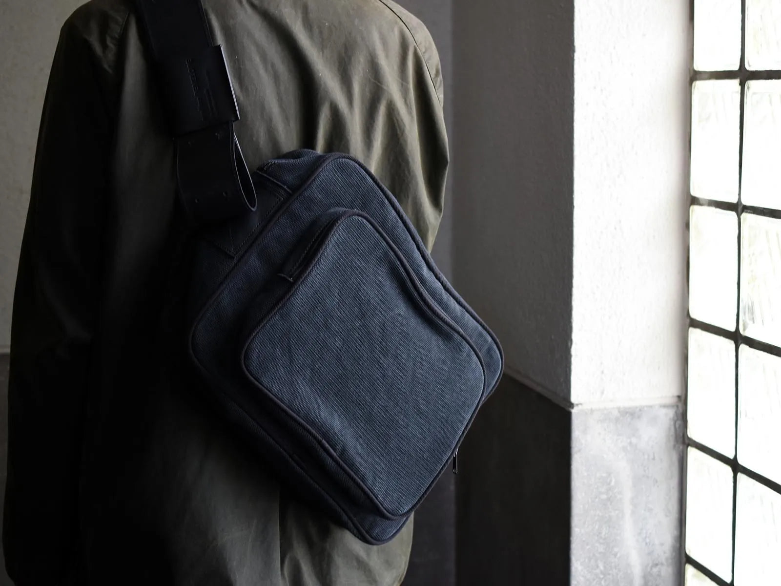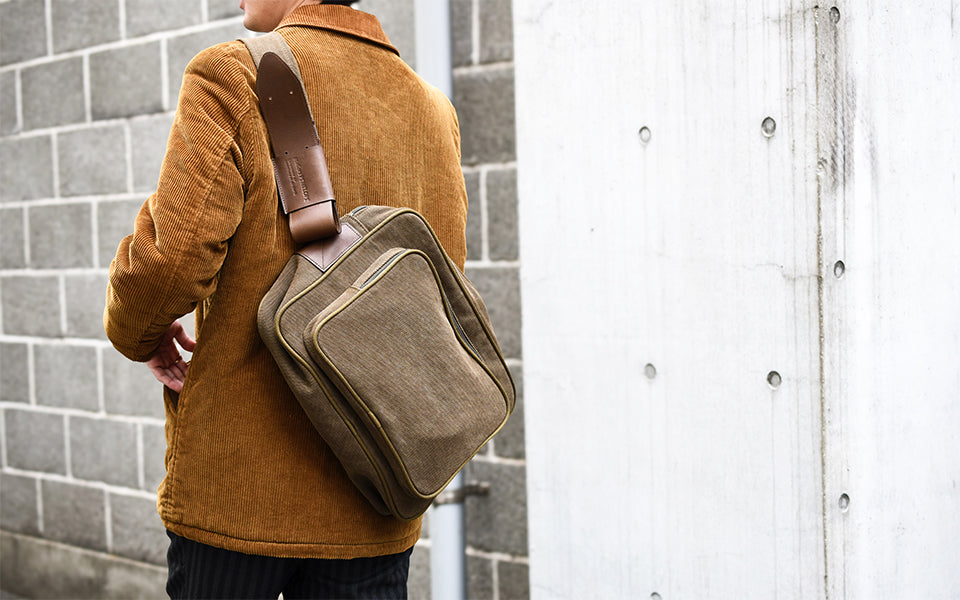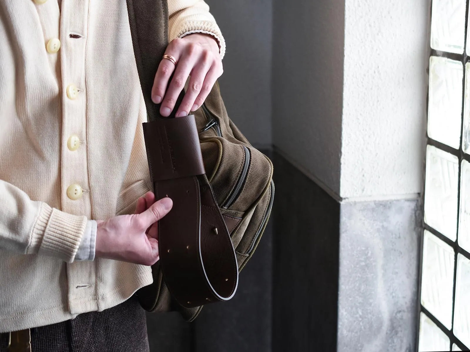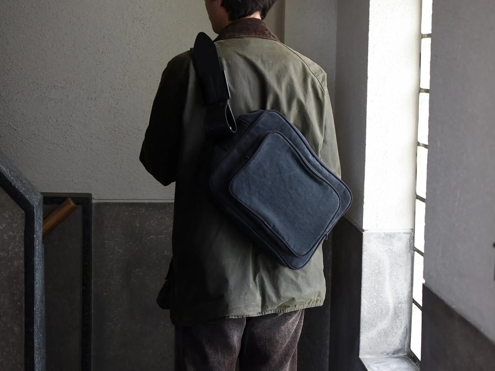 This shoulder bag combines leather with an original Oxford weave fabric woven in Kurashiki, Okayama Prefecture, for a solid, classic feel. The diagonal shoulder strap base creates a three-dimensional silhouette. "Treppe" is German for "step," and the name evokes the step between the bag and the three-dimensional front pocket. The strap length is adjustable via a fastening mechanism, and the logo-embossed belt loop adds a unique accent. Its convenient size can even fit a laptop or A4 documents.