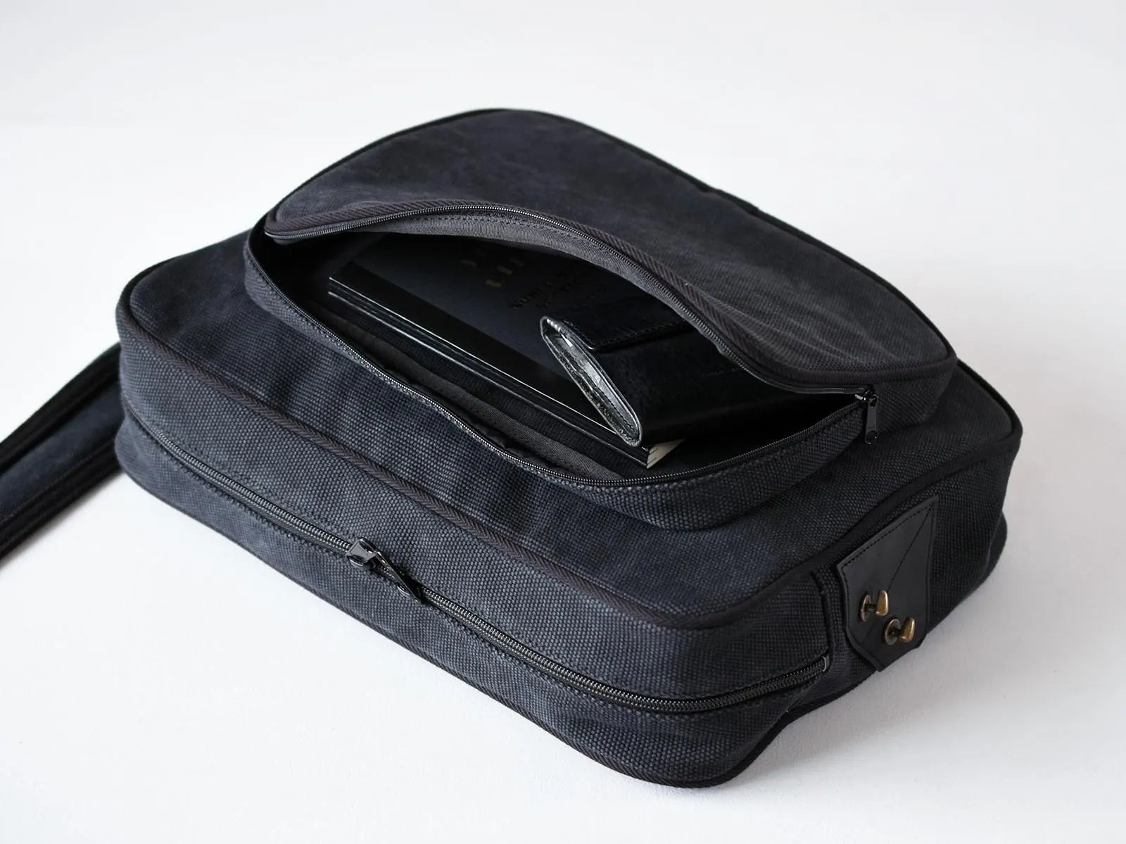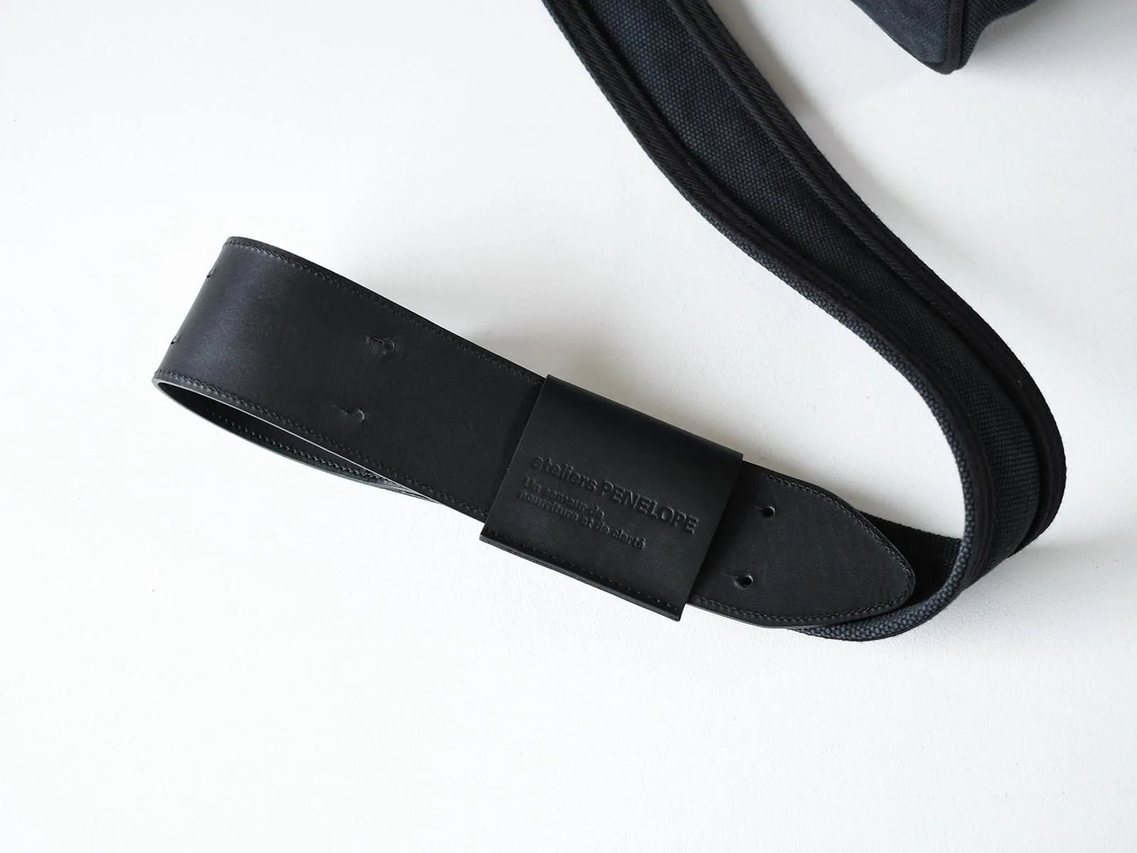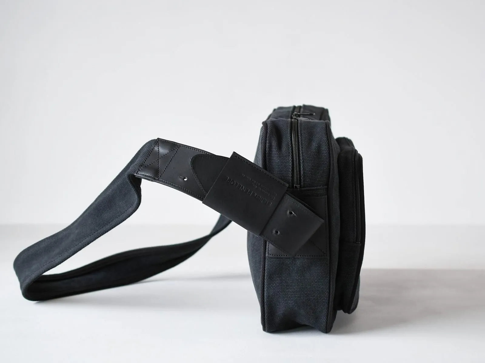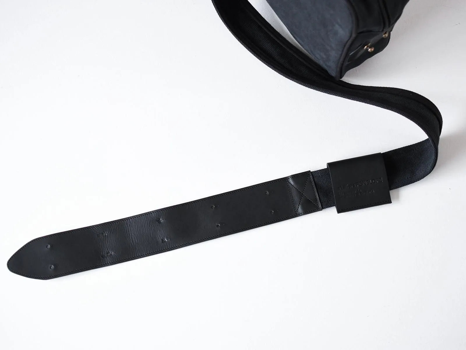 This shoulder bag combines leather with an original Oxford weave fabric woven in Kurashiki, Okayama Prefecture, for a solid, classic feel. The diagonal shoulder strap base creates a three-dimensional silhouette. "Treppe" is German for "step," and the name evokes the step between the bag and the three-dimensional front pocket. The strap length is adjustable via a fastening mechanism, and the logo-embossed belt loop adds a unique accent. Its convenient size can even fit a laptop or A4 documents.