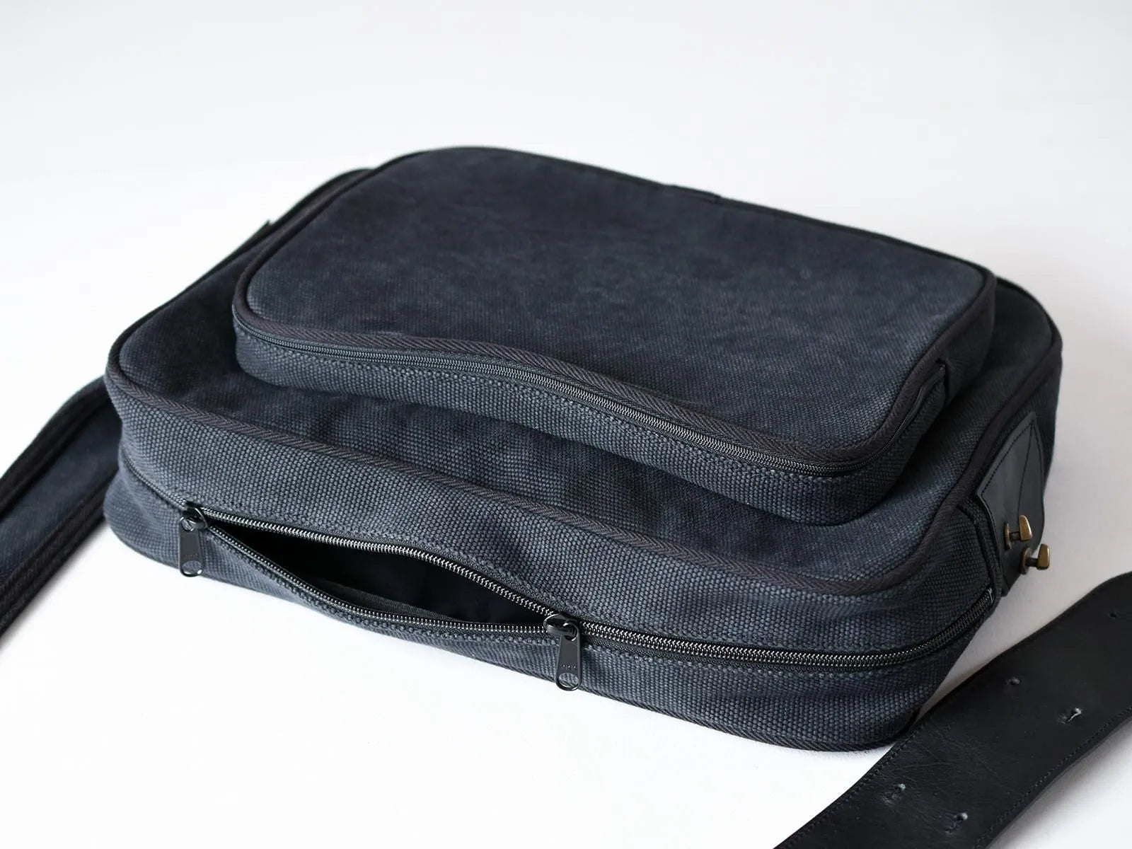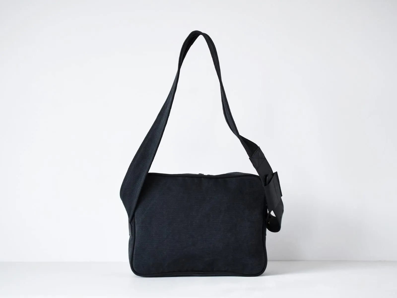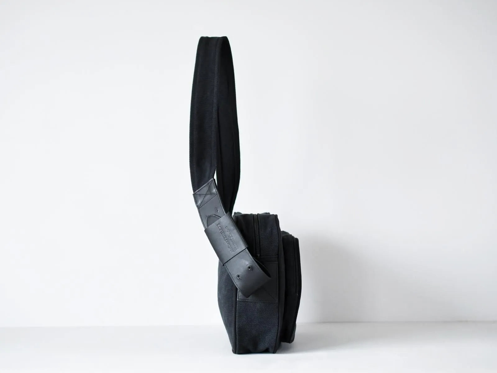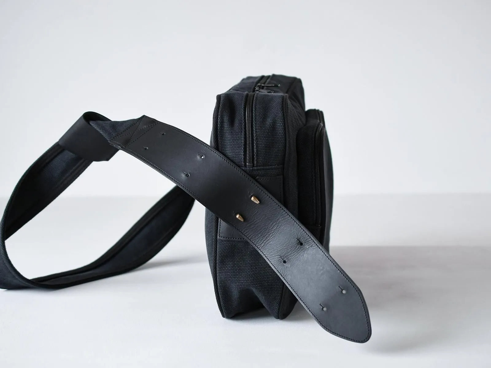 This shoulder bag combines leather with an original Oxford weave fabric woven in Kurashiki, Okayama Prefecture, for a solid, classic feel. The diagonal shoulder strap base creates a three-dimensional silhouette. "Treppe" is German for "step," and the name evokes the step between the bag and the three-dimensional front pocket. The strap length is adjustable via a fastening mechanism, and the logo-embossed belt loop adds a unique accent. Its convenient size can even fit a laptop or A4 documents.
