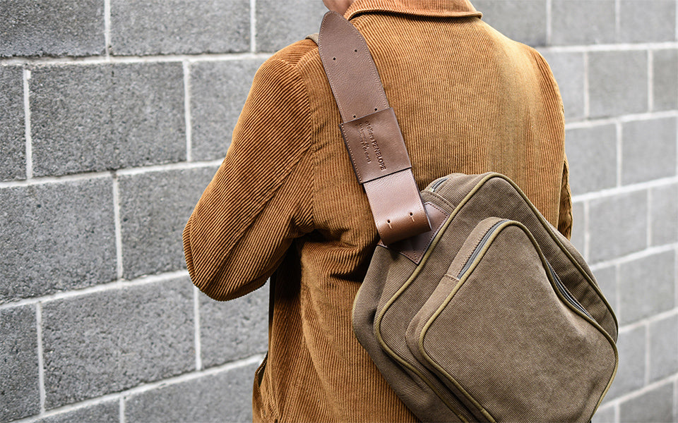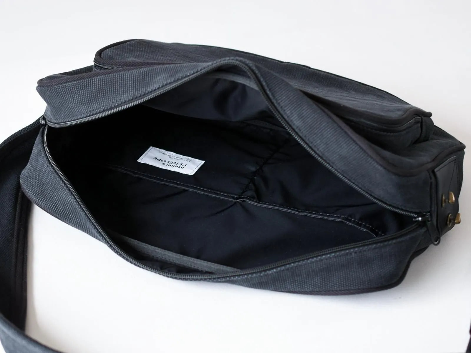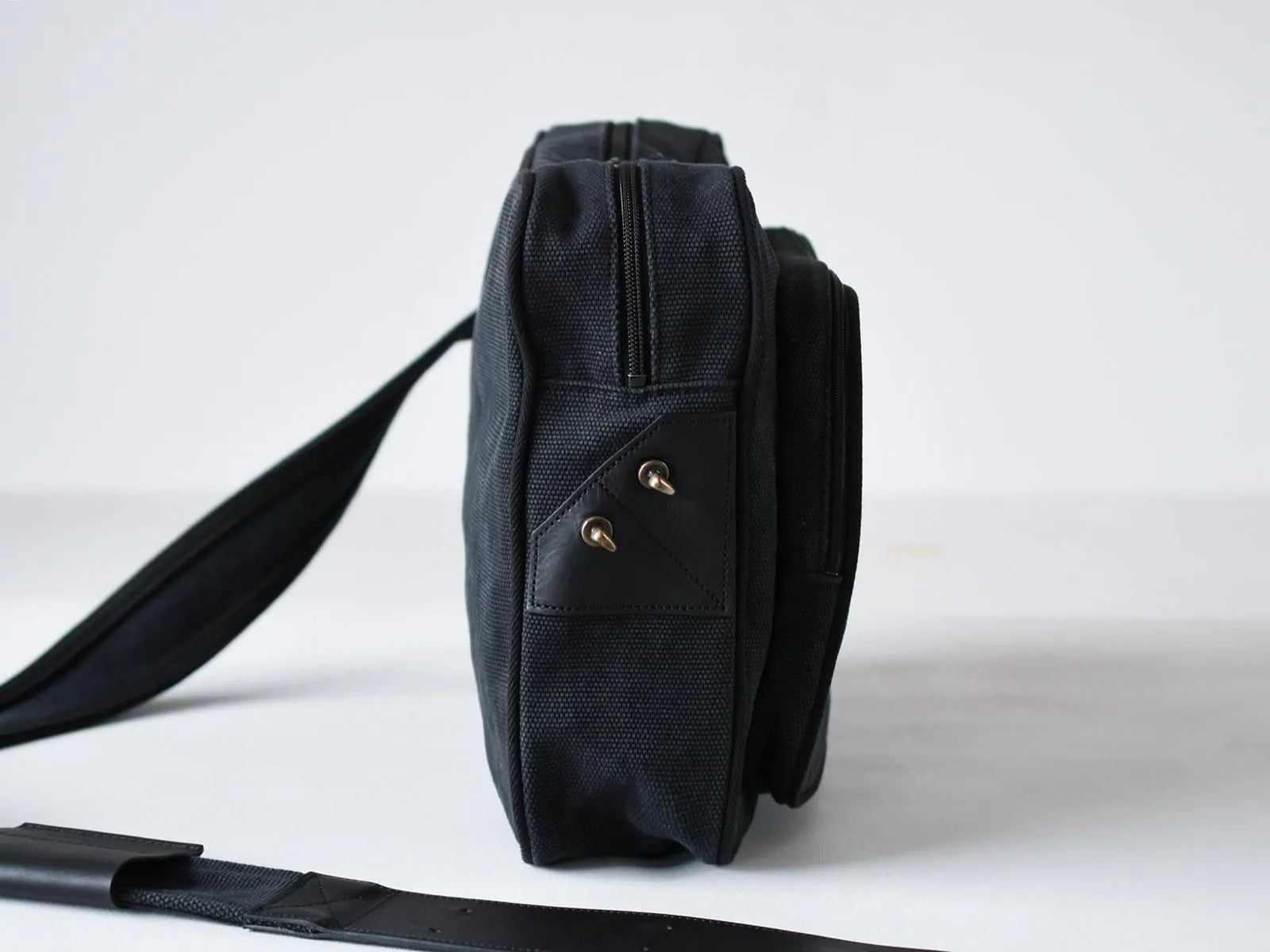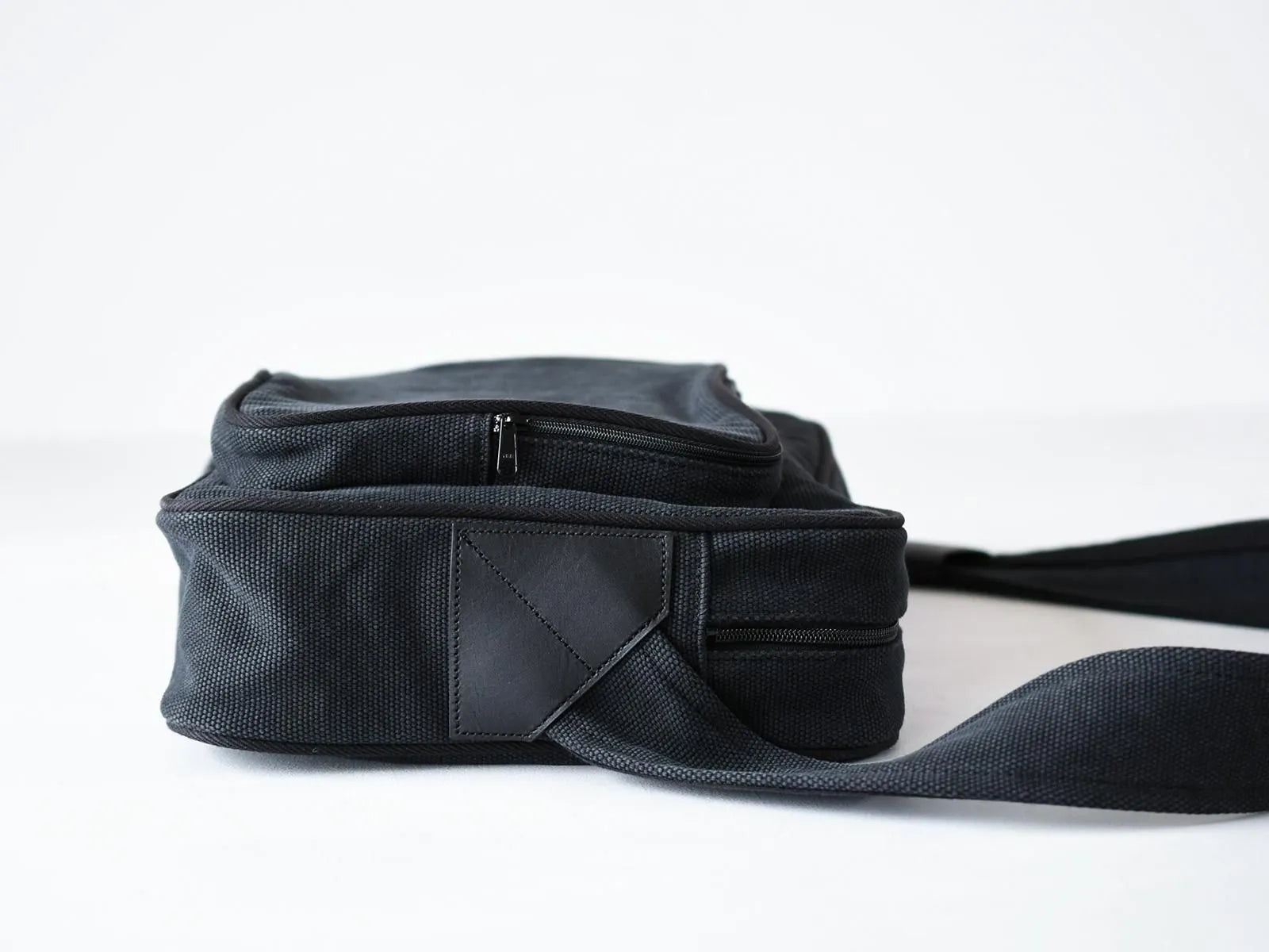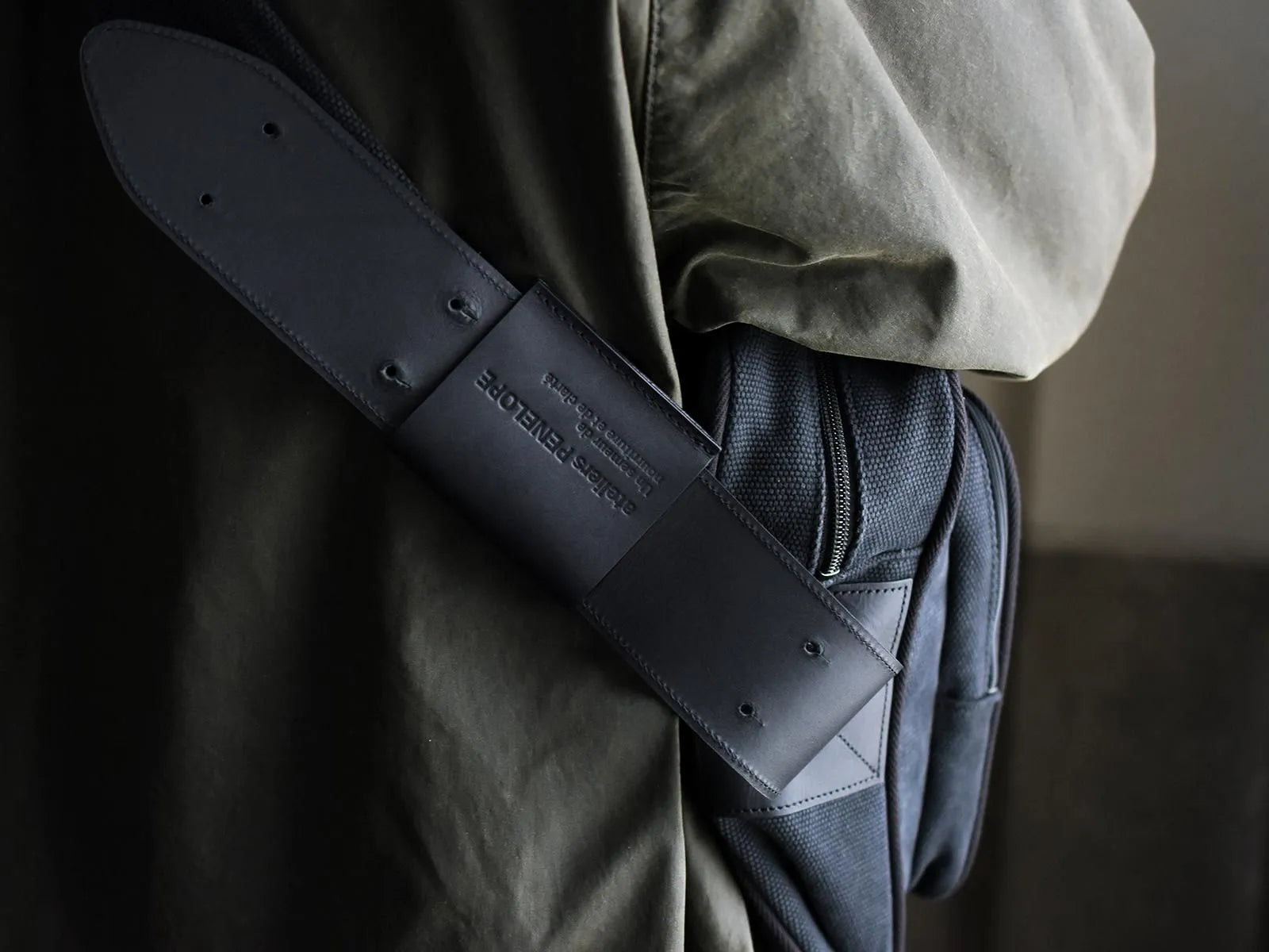 This shoulder bag combines leather with an original Oxford weave fabric woven in Kurashiki, Okayama Prefecture, for a solid, classic feel. The diagonal shoulder strap base creates a three-dimensional silhouette. "Treppe" is German for "step," and the name evokes the step between the bag and the three-dimensional front pocket. The strap length is adjustable via a fastening mechanism, and the logo-embossed belt loop adds a unique accent. Its convenient size can even fit a laptop or A4 documents.