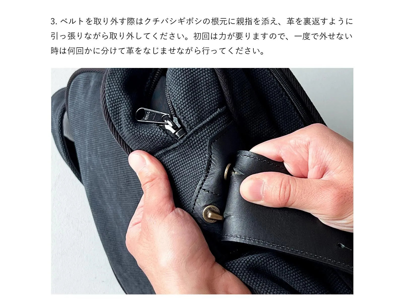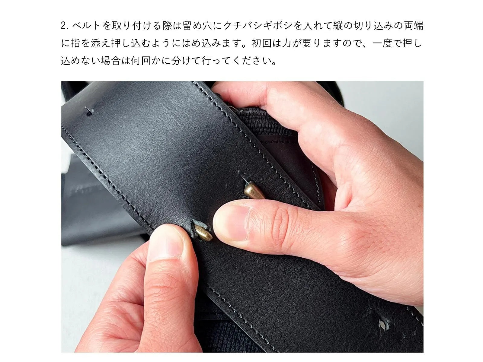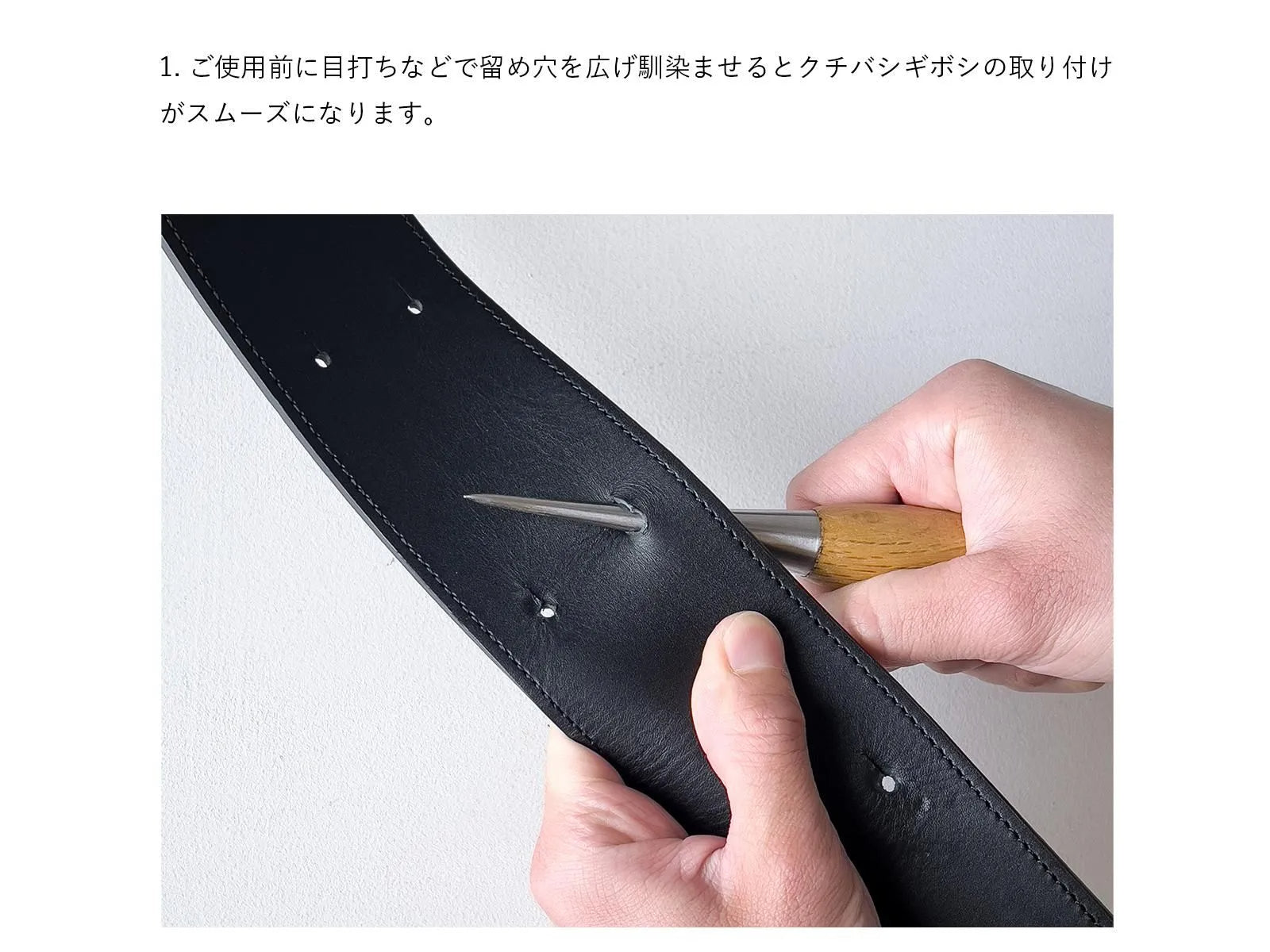 The shoulder strap length can be adjusted to five positions by changing the fastening position of the beak terminal (metal terminal). At first, the leather around the fastening hole will be very stiff and require some force to attach and remove, but with use, the leather will soften and become easier to put on and take off.