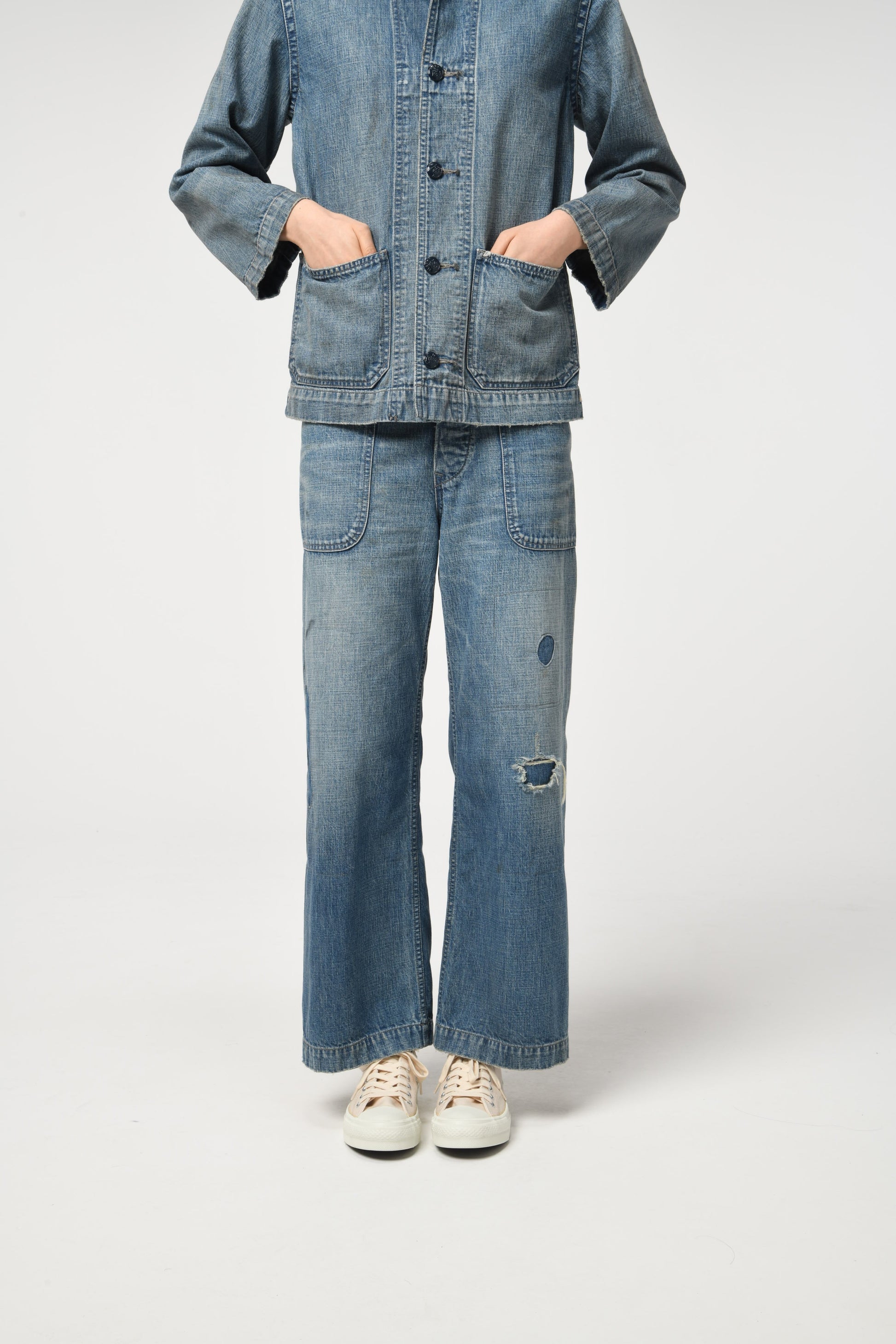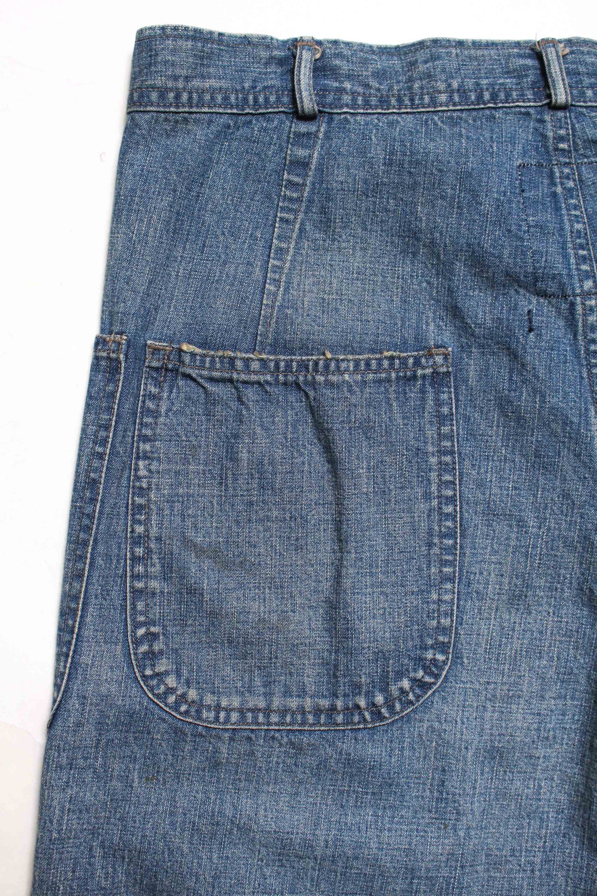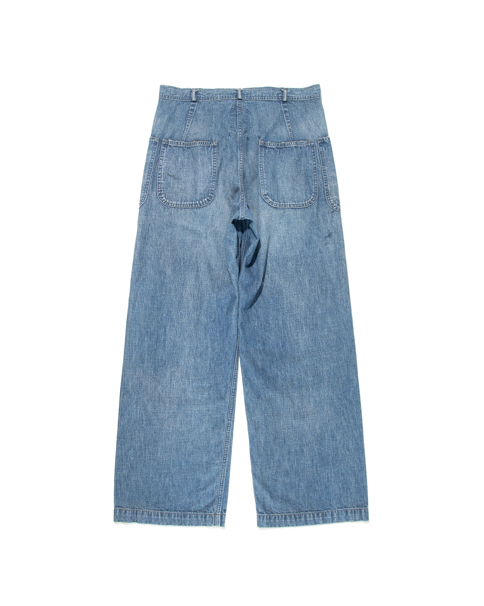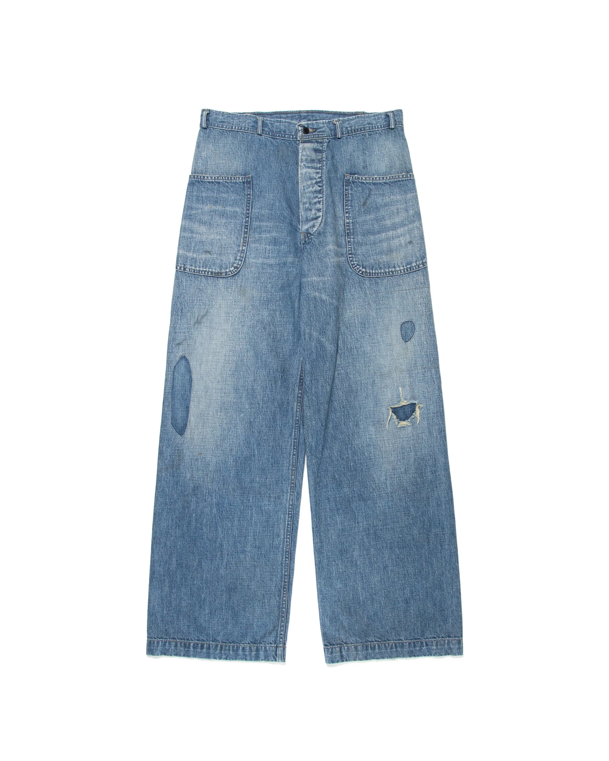 These USN M44 trousers were used by the U.S. Navy during World War II for work purposes. This model is most notable for its design with no side seams, created to provide comfort and ease of movement. Denim dungaree material is used, with specifications that endure as durable and practical work wear. The processed feeling of repairing the torn parts by work pursues realism, and the finish makes those who love old clothes and fashion nod their heads in agreement.