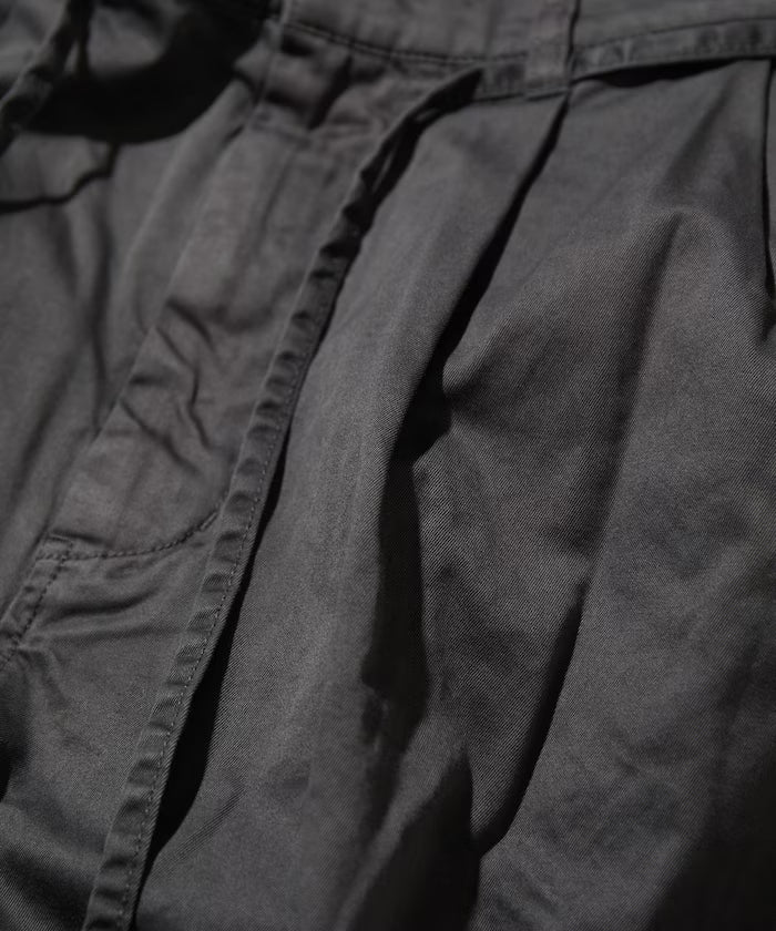 "These two-tuck wide chino cloth shorts are made from organic cotton grown in New Mexico, USA, and the highest quality Pima cotton (Supima cotton), a long-fiber variety. They are woven in a high-density twill weave using triple-ply yarn made from three strands of twisted thread. This gives the shorts a slight sheen and firmness. They are then dyed and bio-processed after they are sewn into a finished product, giving the fabric a worn and worn look." (AH)