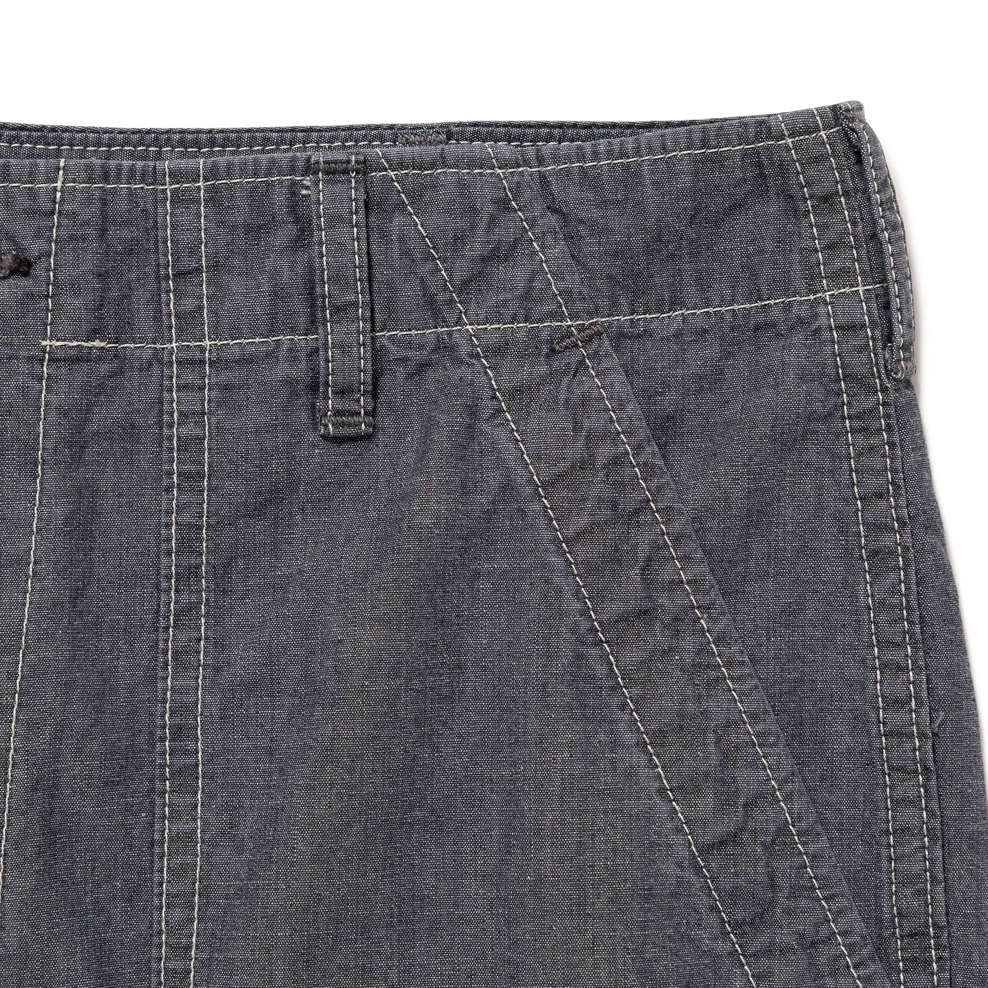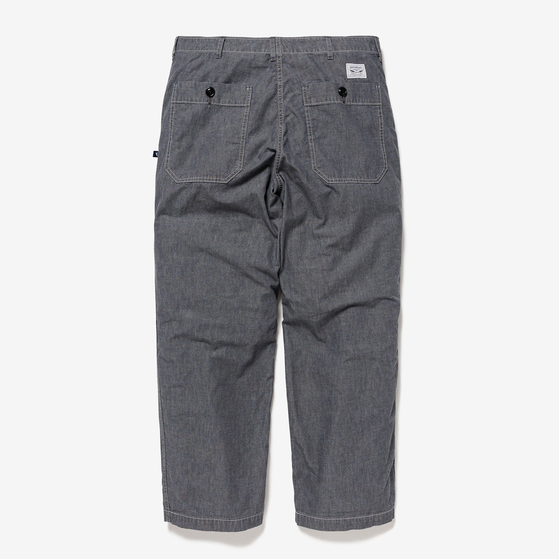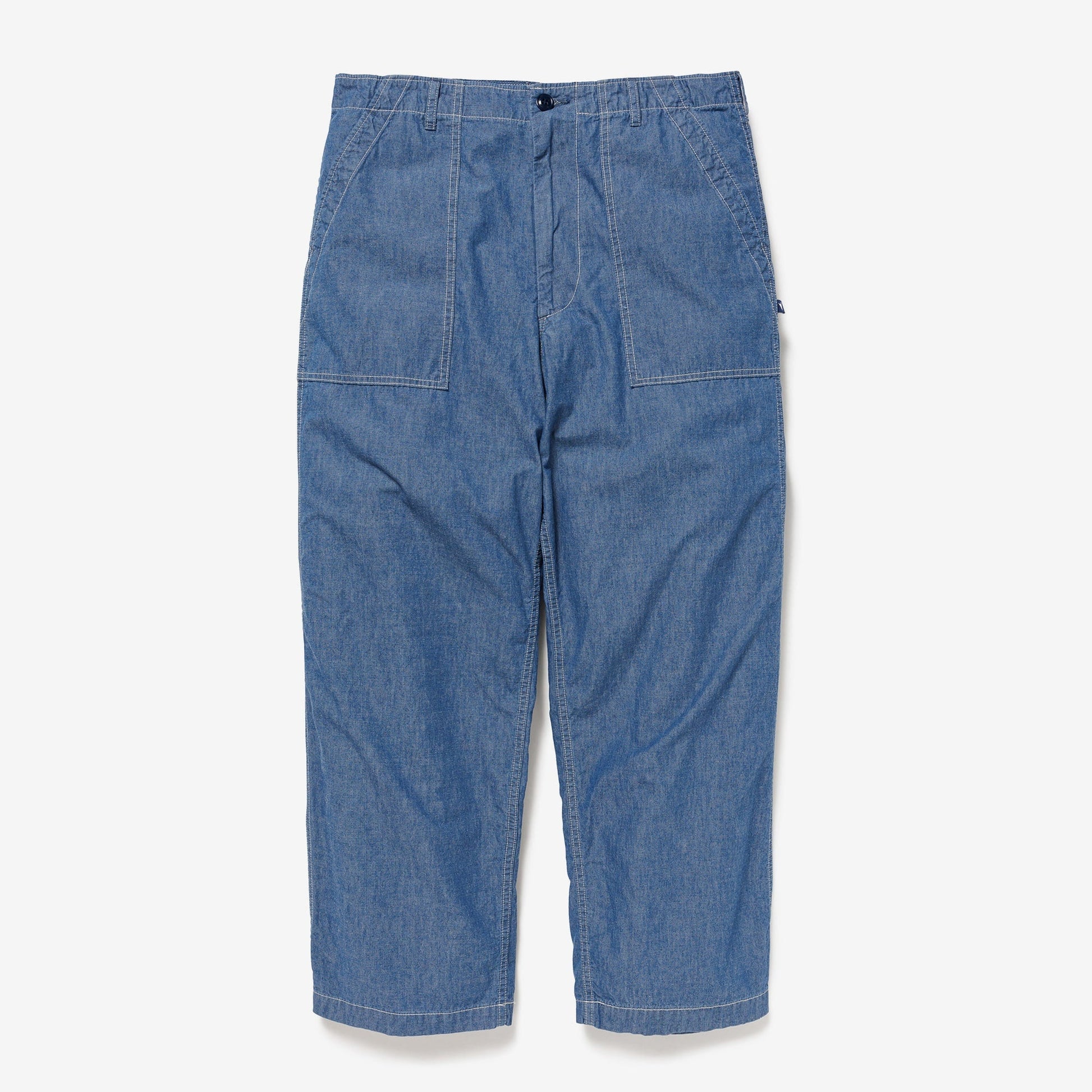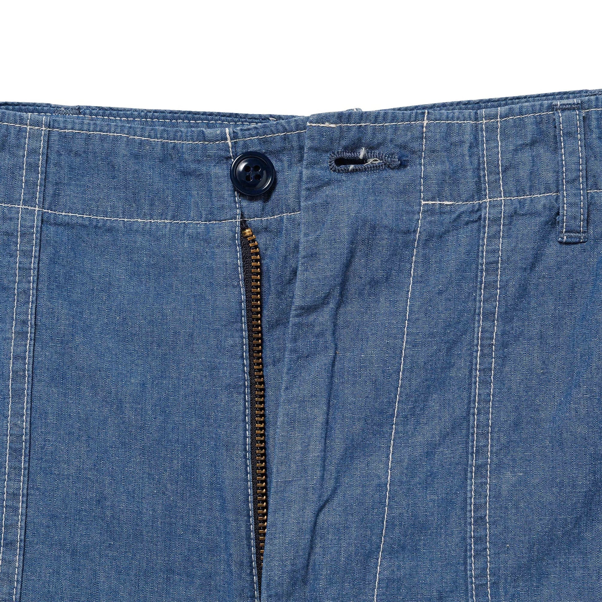 BAKER Chambray Trousers made from 6.3oz uneven chambray yarn and finished with a deep color by washing. Patch-like side pockets are arranged around the waist of the no-tuck, and a button-fastened patch pocket and CROSS PADDLE woven name are attached to the back.