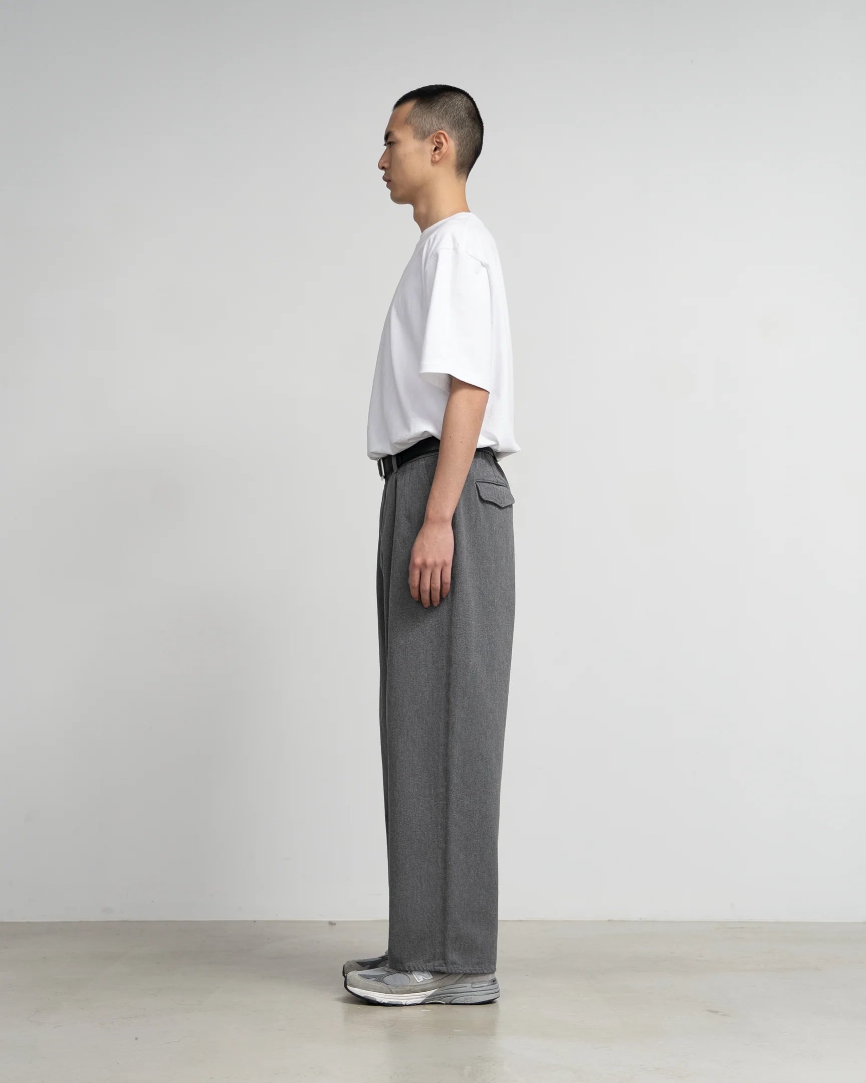 Original color fast denim that uses a dye with excellent fastness instead of indigo dye that does not easily fade. The effect of the highly twisted yarn creates depth in the twill on the surface, which prevents fuzzing and keeps the fabric dry and smooth to the touch. Gray uses triple-twisted top yarn for the warp and black for the weft to create a look that looks like the front and back are reversed. Wide straight pants with a tuck at the waist and ample room from the hips to the waist.