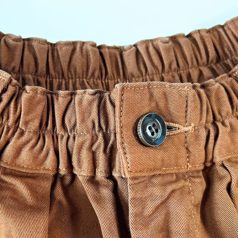 The waist is elastic for a relaxed fit, and the 100% cotton chino fabric has a rough feel and is comfortable to wear, becoming more comfortable against the skin the more you wear it.