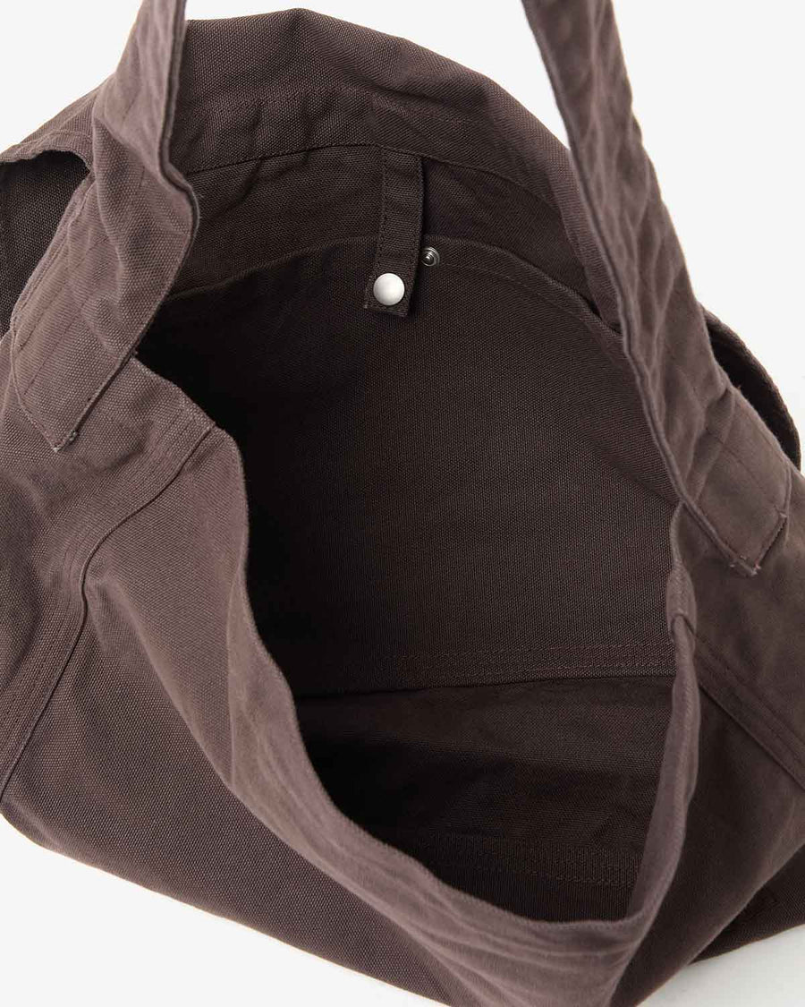 This shoulder bag is made from No. 8 canvas, a plain weave of twisted cotton yarn.