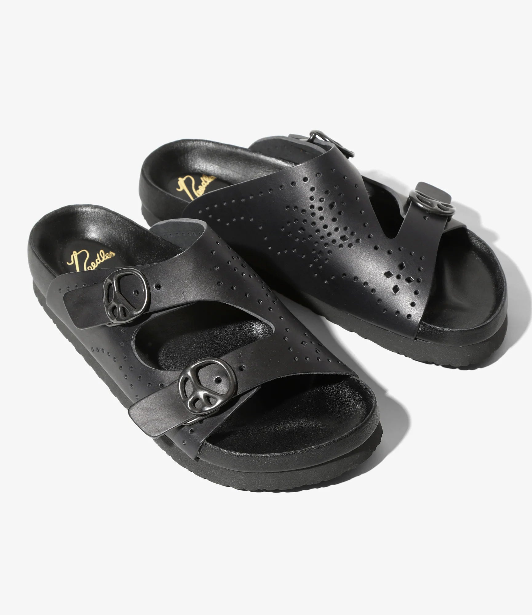 This authentic double-strap sandal features a peace sign buckle, perforated papillon embellishments, and an all-over papillon print on the outsole. This season, it comes in a stylish smooth leather design. The basic design is packed with NEEDLES' signature design.