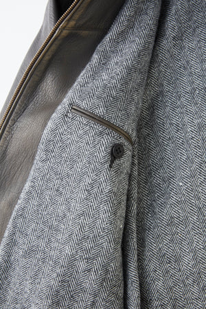 Patina leather pieces are our signature material. The flavoring process, which naturally expresses the changes over time, is done by hand one by one according to an original recipe that was completed through repeated trial and error. The design inspiration is a custom-made leather jacket made before WW2. The very elaborate sewing specifications and seemingly unusual details unique to custom-made items at that time are eye-catching. The Italian collar that beautifully draws an arch from the inside of the body gives it a very classical and elegant look. The deerskin, which is characterized by its luxurious and soft texture, is finished with high-quality chrome tanning, which is also used for gloves. The patina aging gives it a very soft and light and sexy appearance. The more you wear it, the more flavor it will gain. The fabric is made of deerskin made from New Zealand rawhide that has been chrome tanned, giving it a fine texture and a pleasant feel. The lining is made of British wool tweed. British wool has little oil and is thick, so it has a dry touch. It has high heat retention.