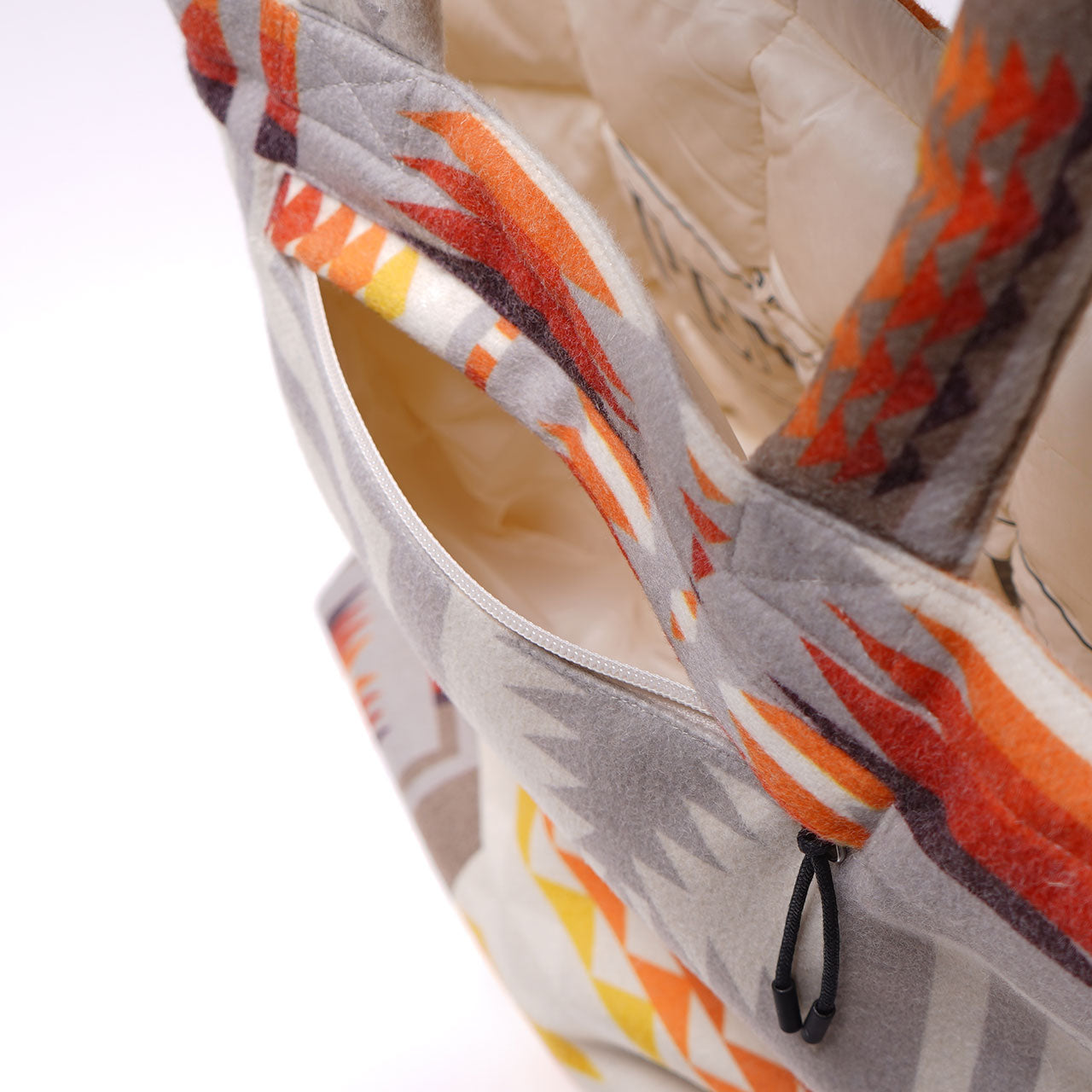This is a reversible tote bag. One side is made of water-repellent nylon taffeta, while the other side with a native pattern is made of a warm wool-blend polyester melton.