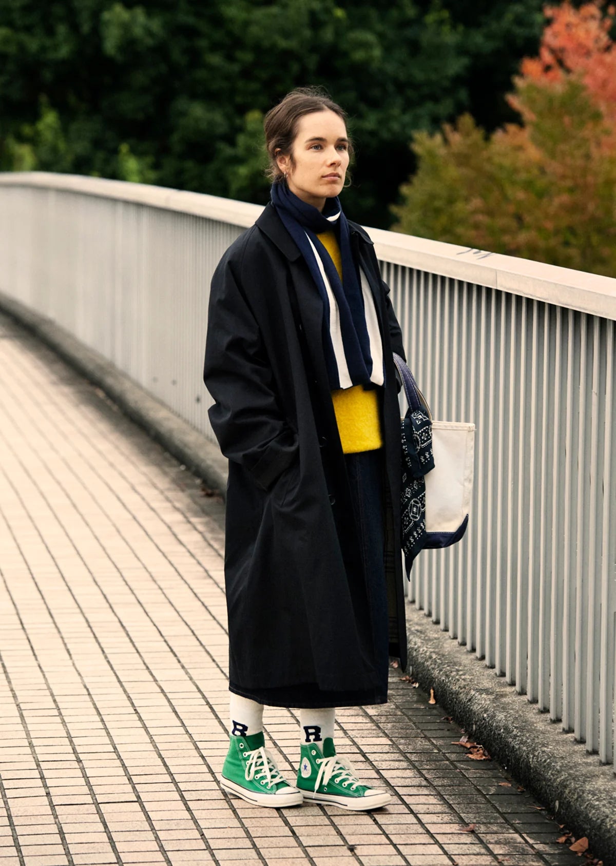 The cotton fabric of these soft piled socks is modeled after vintage sweatshirts. For a more similar look, each sock is knitted with Raffy yarn, uneven yarn produced by blending 25% of cotton waste in long staple cotton. To maintain the unique uneven feel, the yarn is slowly spun at Japanese factories with a spinning method that has not been changed for over 50 years. The irregular surface is not seen on modern mass-produced products, adding a retro feel like vintage sweatshirts to the item. The ‘R’ for ROTOTO is inlaid on the side with cut boss knitting to resemble a felt patch on a sweatshirt.