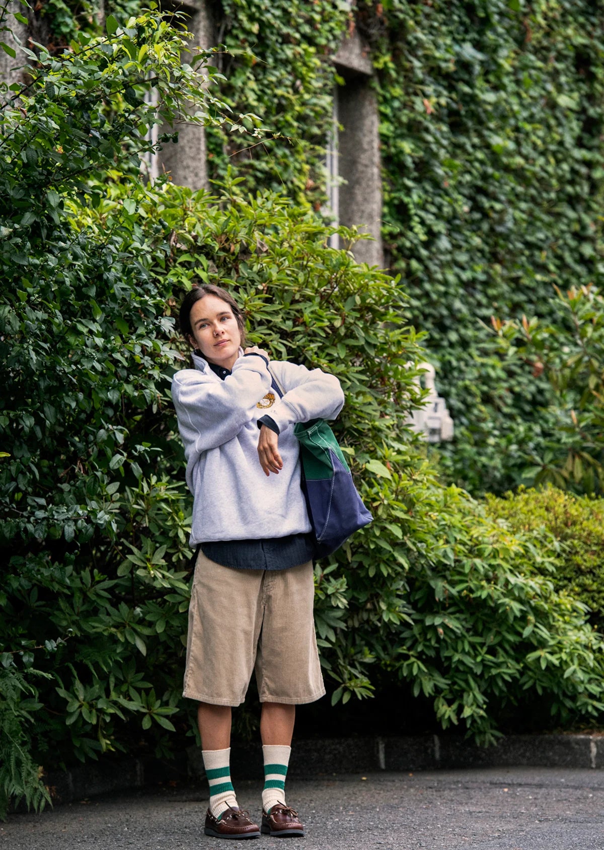 Low-gauge socks featuring a bold 1x1 rib and four distinctive stripes. Made from recycled cotton spun from unused short fibers—known as “fallen cotton”—collected at spinning mills in Japan. The yarn is tightly twisted for a dry, crisp texture and a comfortable fit.