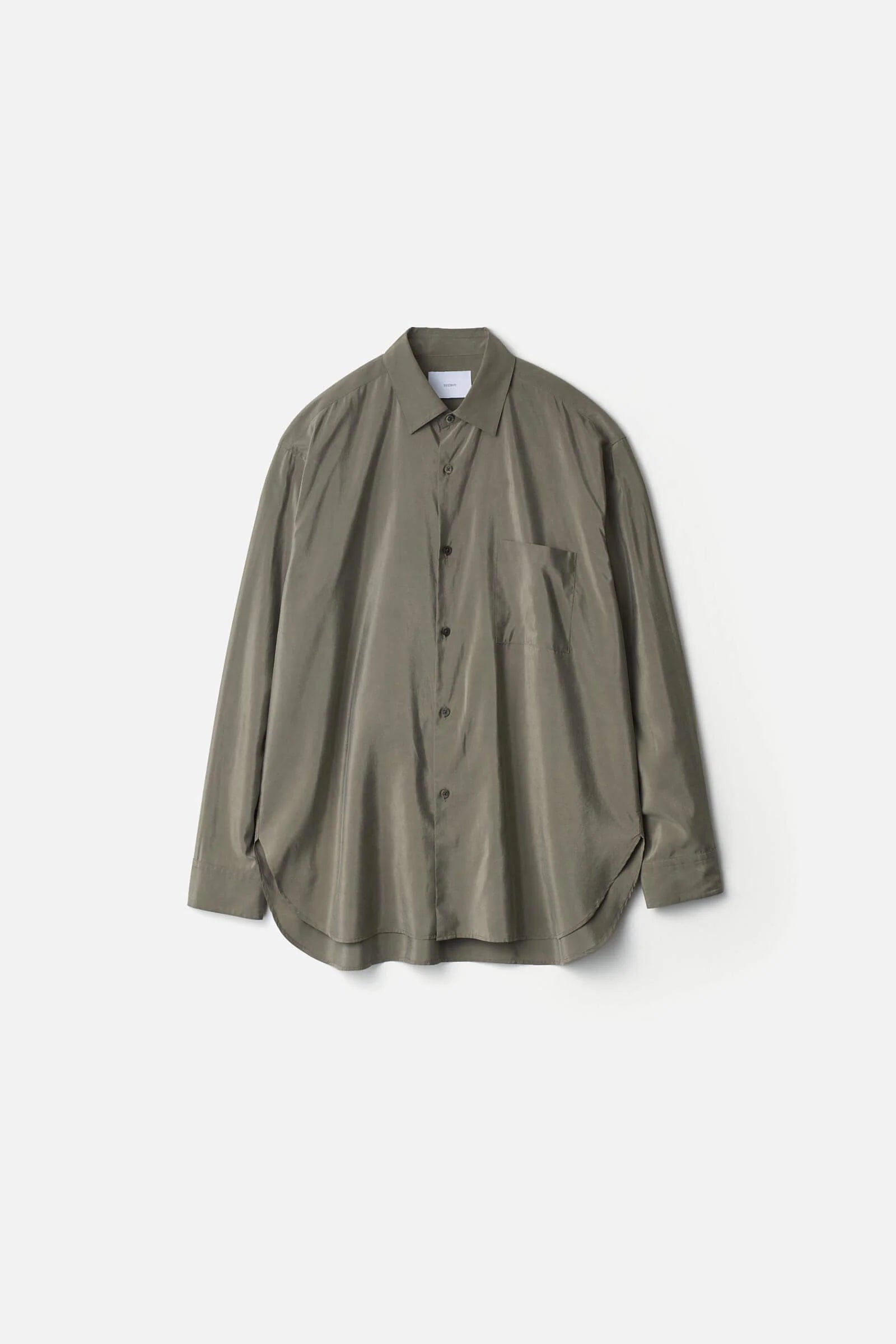 This item was produced by sand washing after dyeing. It is a regular collar shirt made of an original peach-touch silk nylon fabric that utilizes the fibril phenomenon of silk thread.