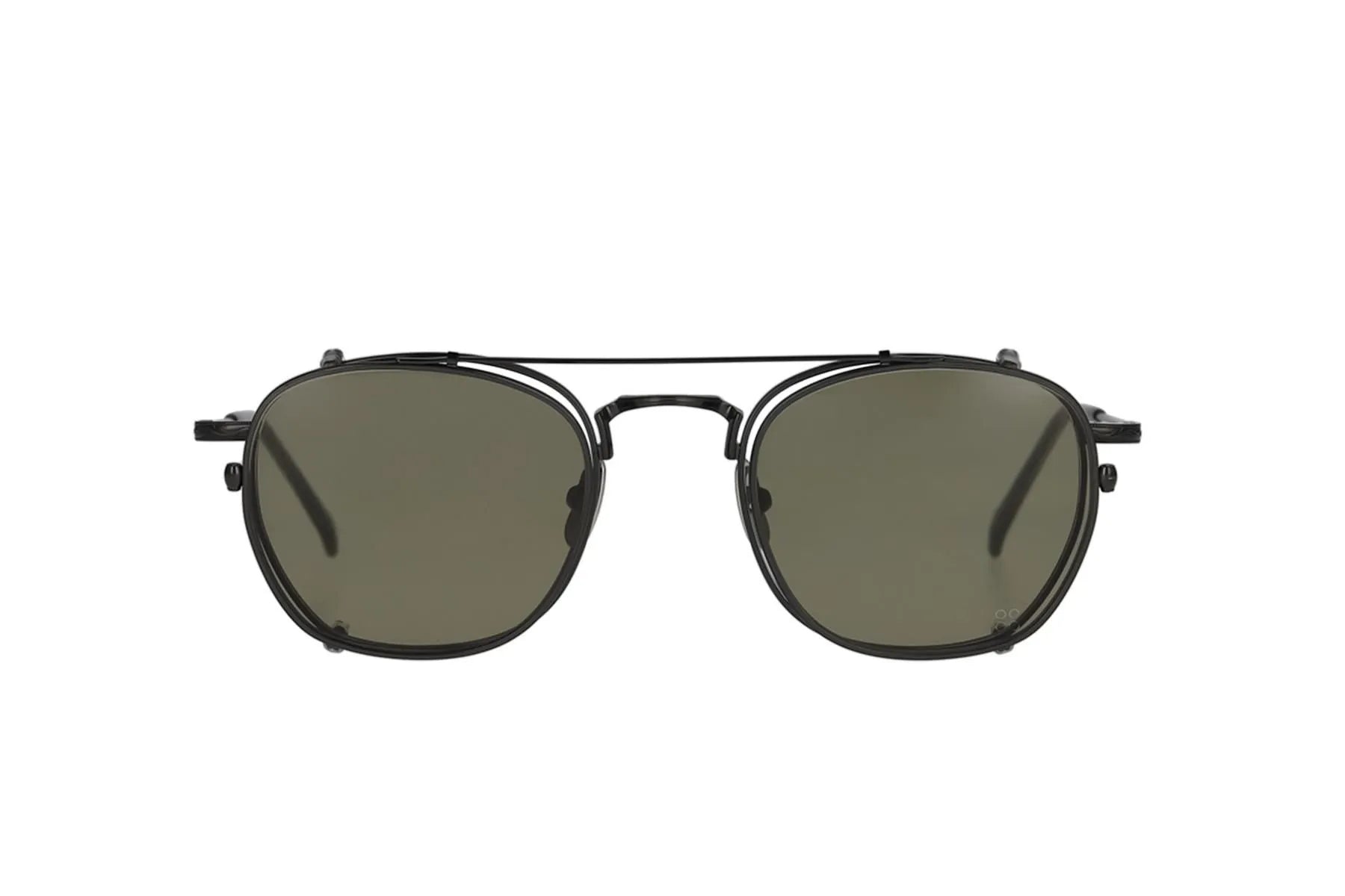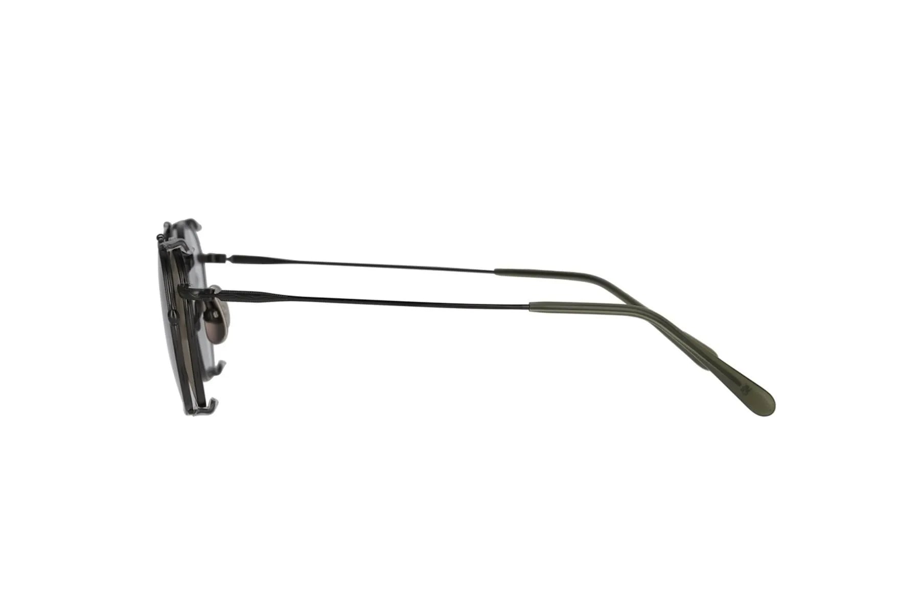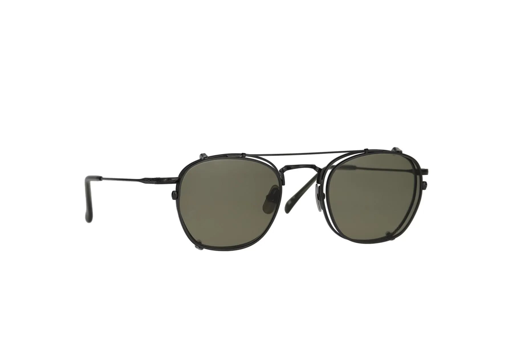 The square-shaped, all-titanium metal frame FRANK comes with clip-on sunglasses. The bridge and temples are intricately engraved for a luxurious look. The clip-on sunglasses transform the style into double-bridge sunglasses. The clips are lightweight and easy to remove thanks to the ultra-elastic titanium bar.