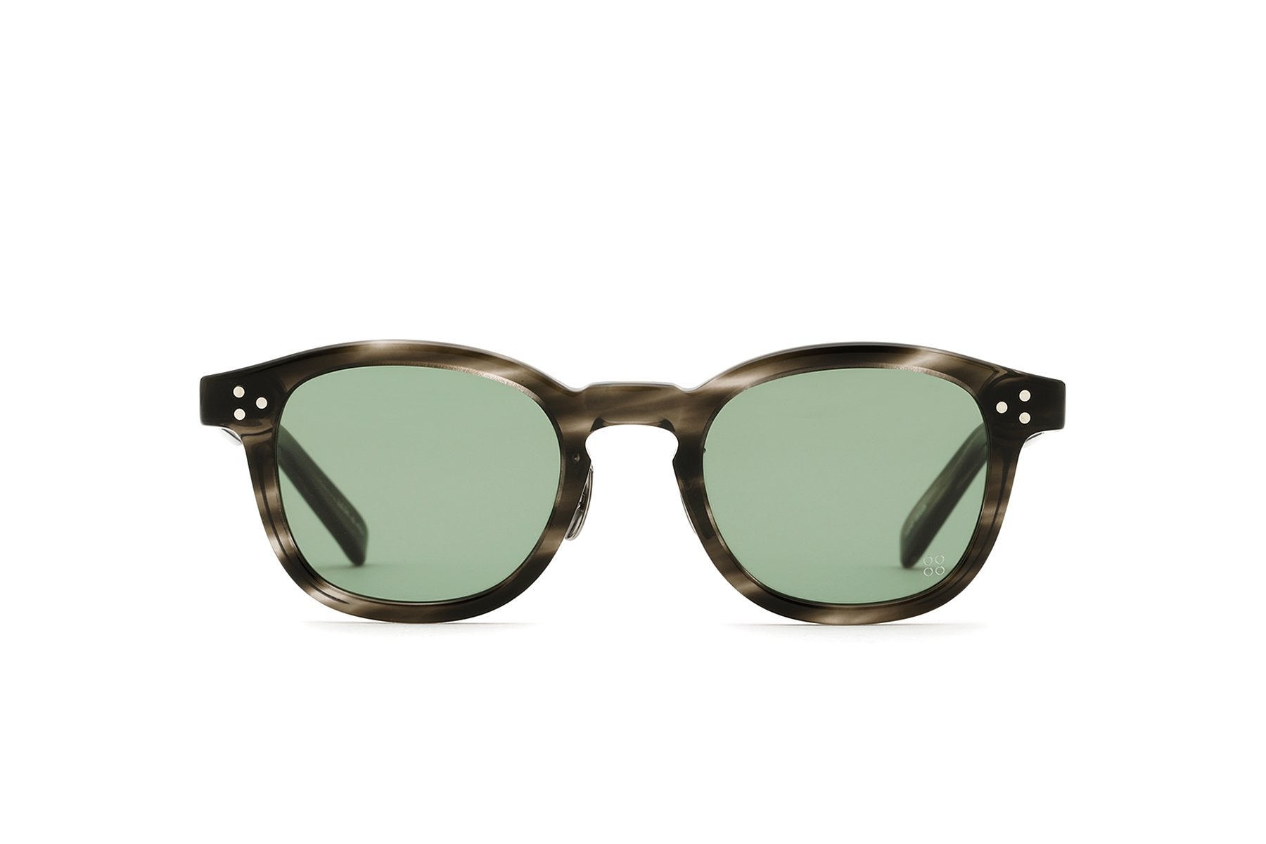 Wellington-style sunglasses with a simple and beautiful shape. Designed to be slightly thick, this model has a moderate presence. While adopting classic details such as a keyhole bridge and three-point studs on the front frame and temples, titanium nose pads and a thin inner temple improve the wearing comfort.