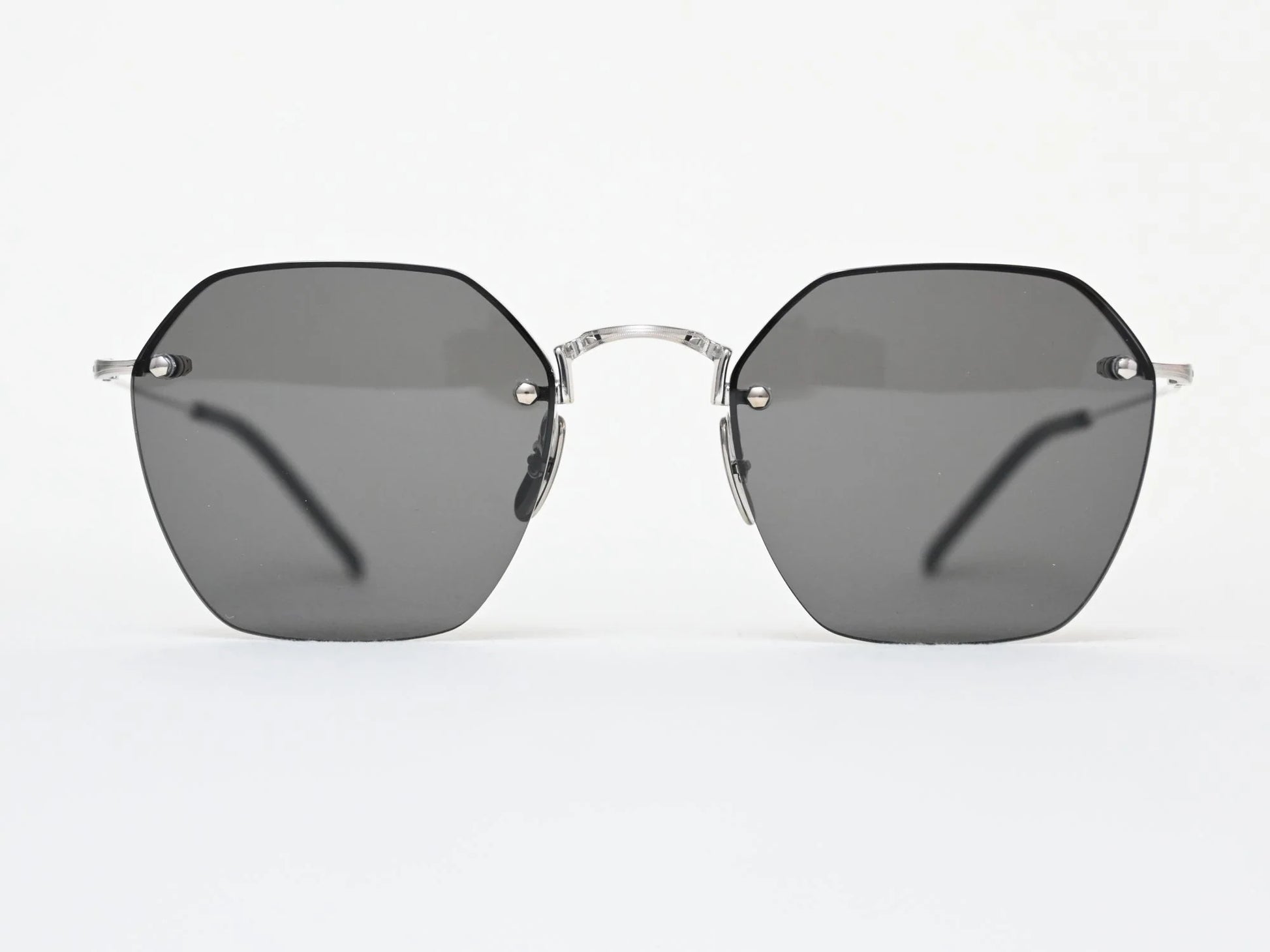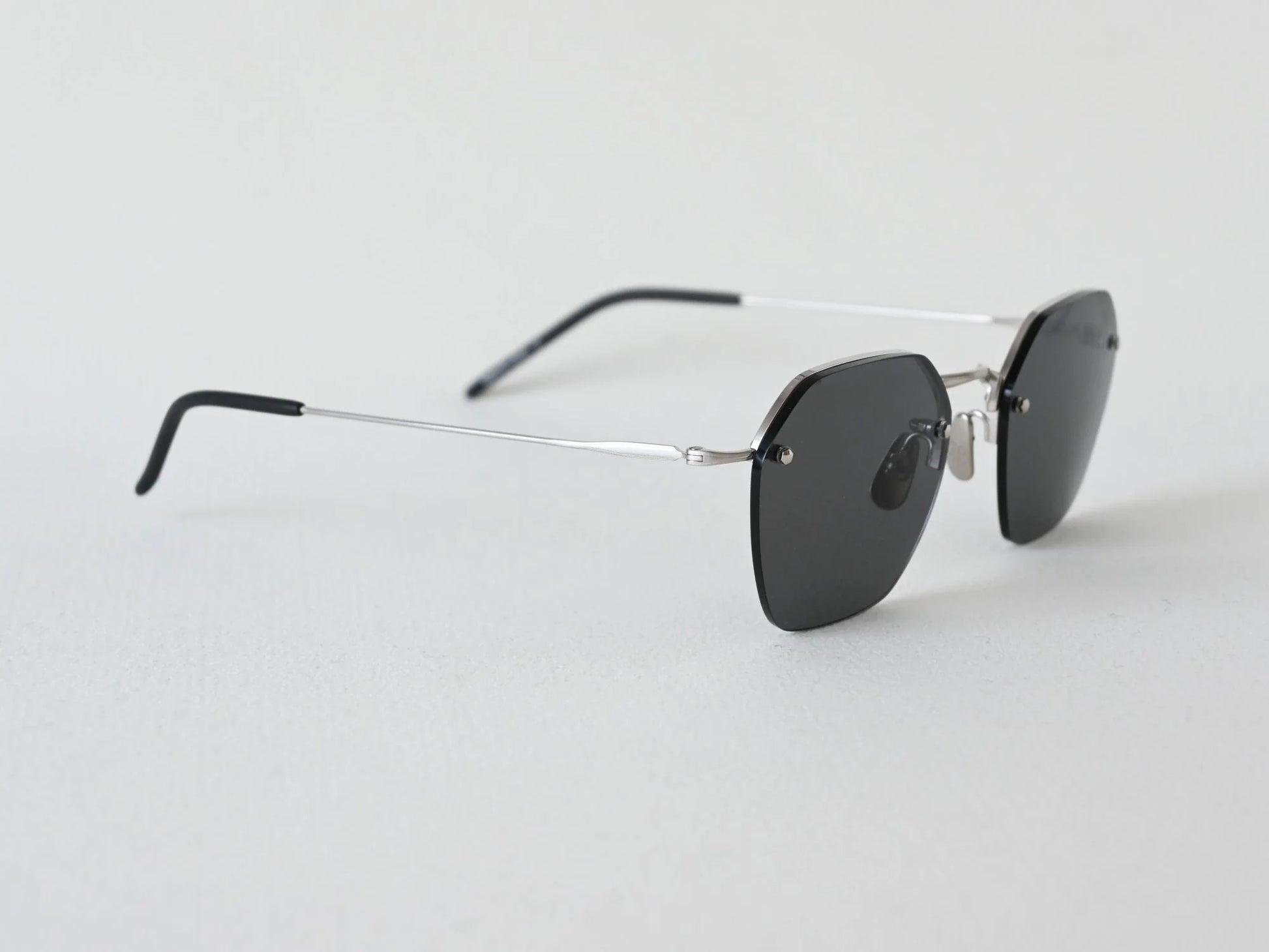 Yellows Plus's hexagonal two-point sunglasses, ROBERT. The back rim is fixed with titanium parts on the back of the lens. The lens shape, gradation color, and matte metal parts give it a sharp, mature look.