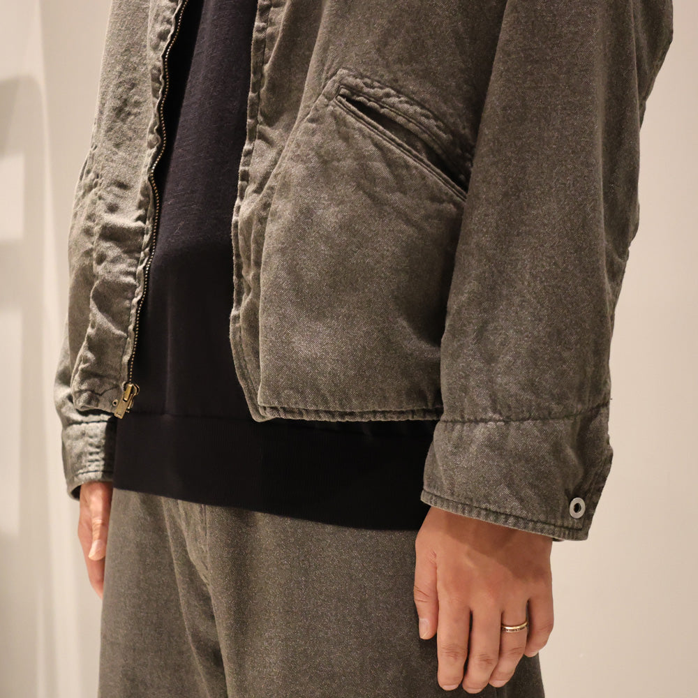The yarn is dyed with sulfide dyes, which further expresses the irregular twisted heathered look as the color fades, resulting in a high-density chambray gabardine that looks vintage.
