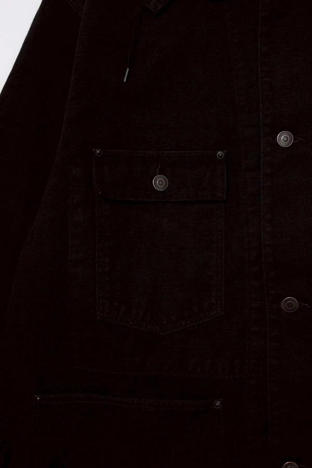 Based on a 1930s coverall. It features sloping shoulders, low sleeves, a natural shoulder, and a slightly longer length for a relaxed A-line silhouette. It includes a detachable hood with a matching corduroy lining.