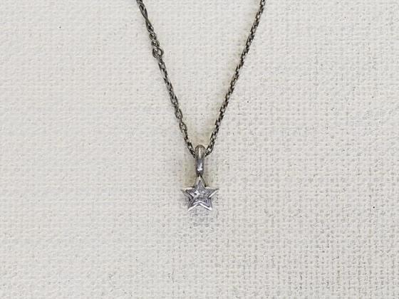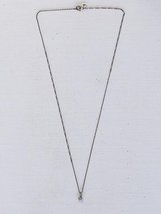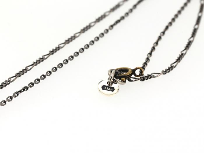 Crazy chain made of three types of silver chain (Figaro, cut cable and plain cable), smoked and combined in black. The top, set with a covered cubic zirconia, is a simple motif, yet it makes a glamorous statement on the chest.