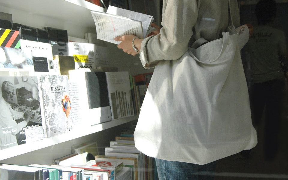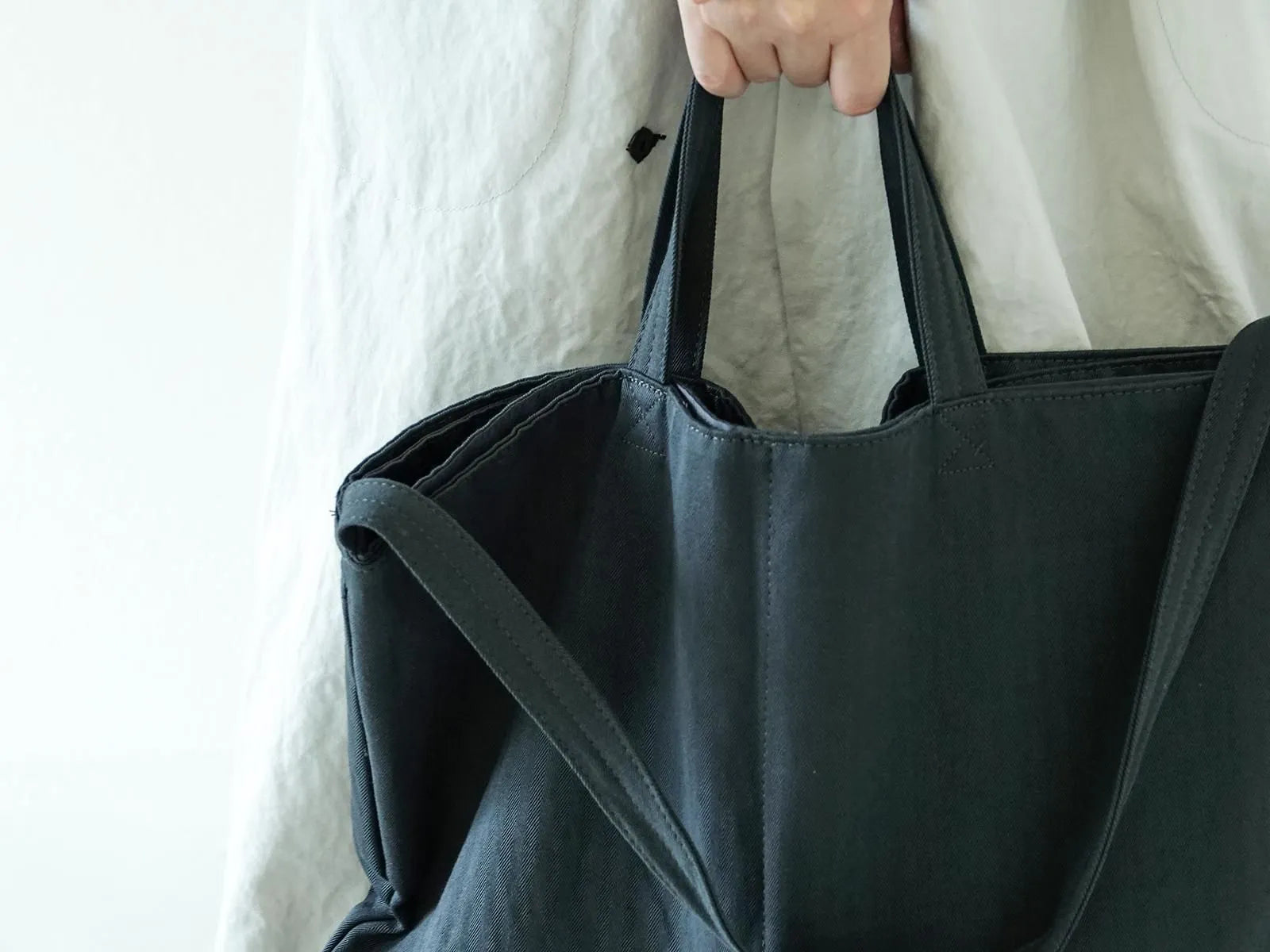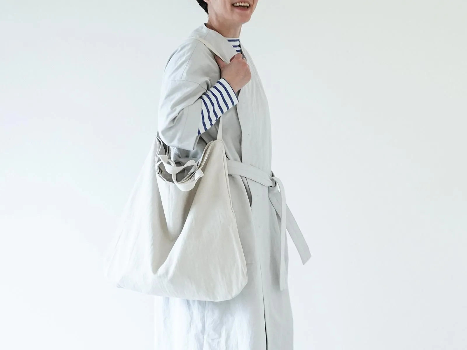 This 2-way bag has no gusset and is made from an original cotton-linen herringbone weave. Utilizing the inside fold, two internal pockets, half the height of the body, are attached to both sides of the opening. The soft, relatively thin material can be folded and carried, making it suitable for use as a secondary bag.