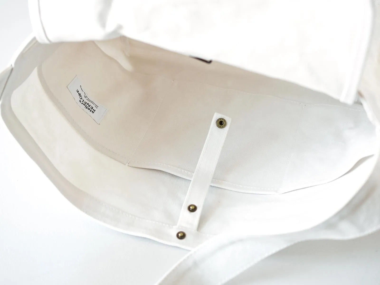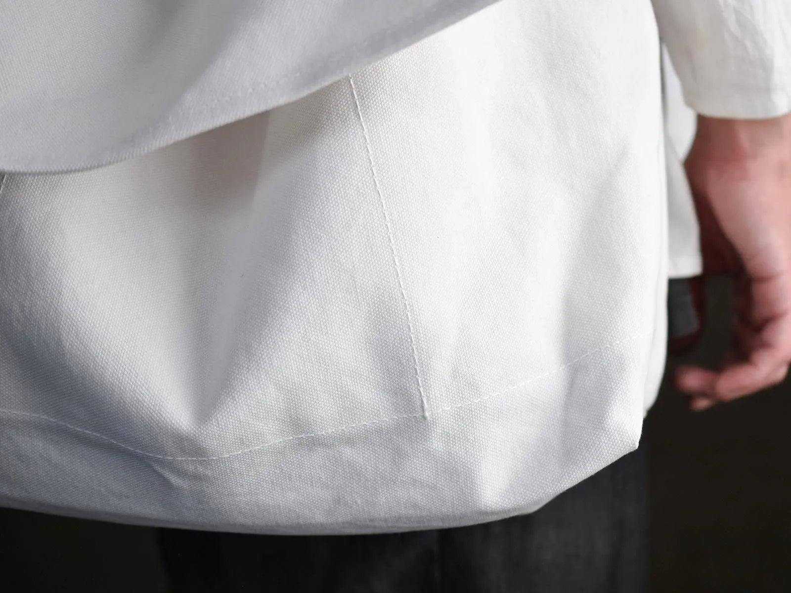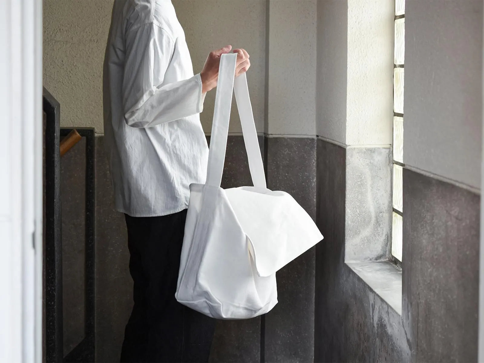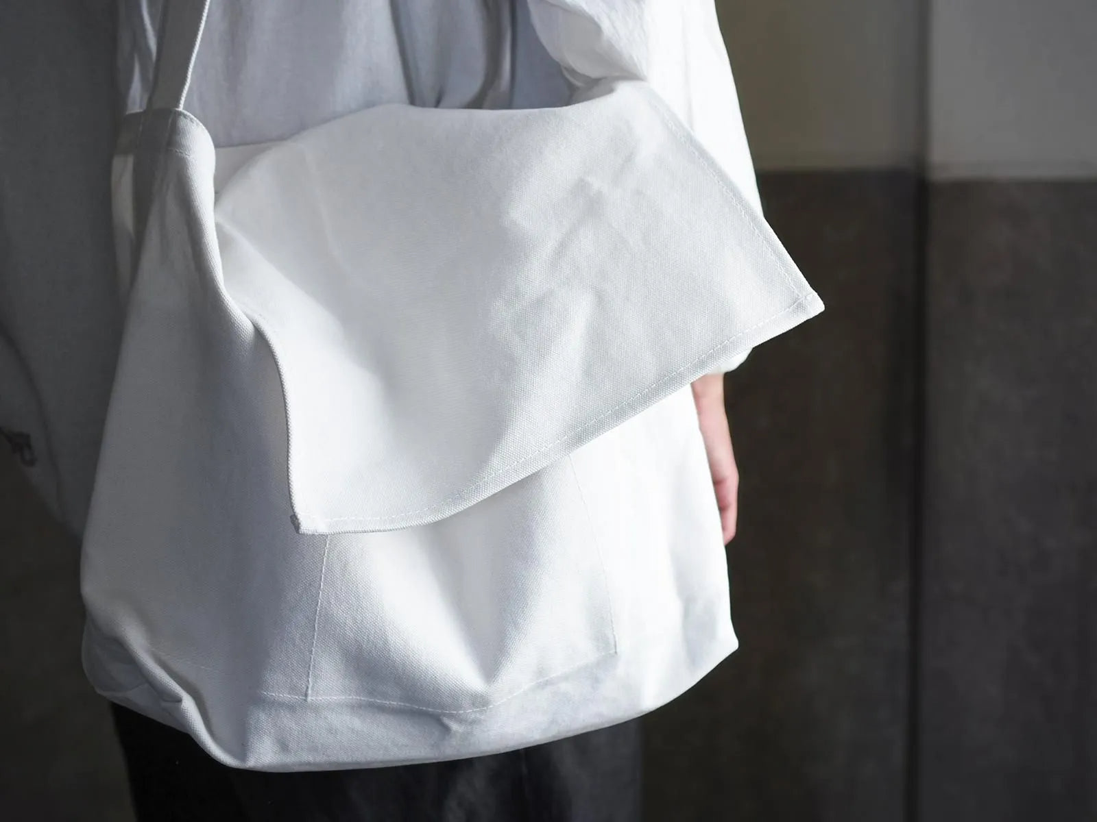 This large one-shoulder bag is crafted from durable No. 6 canvas (bio-washed) and is ideal for carrying a laptop, documents, and other items. The shoulder strap and divider pocket are attached to the inside, with the stitching intentionally exposed on the outside. The cover can be tucked inside or pulled out as a flap, allowing you to enjoy using it however you like.
