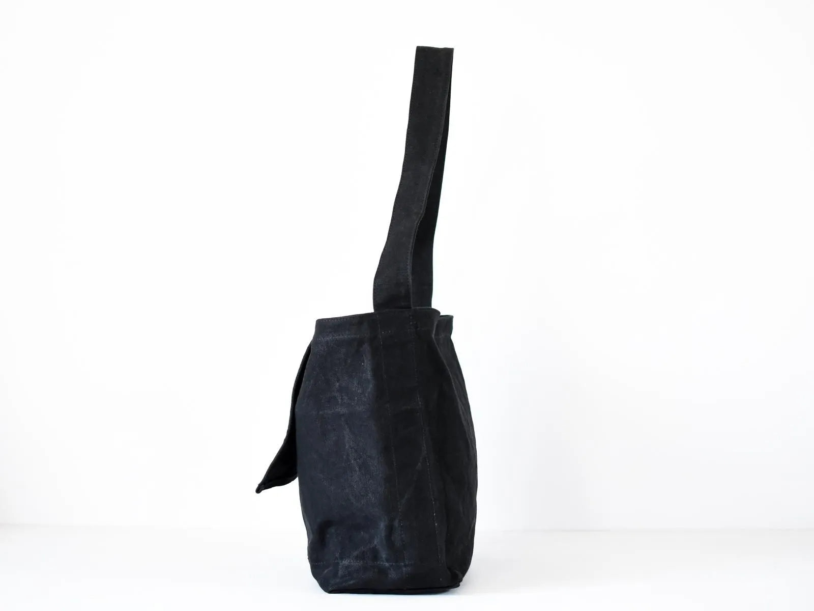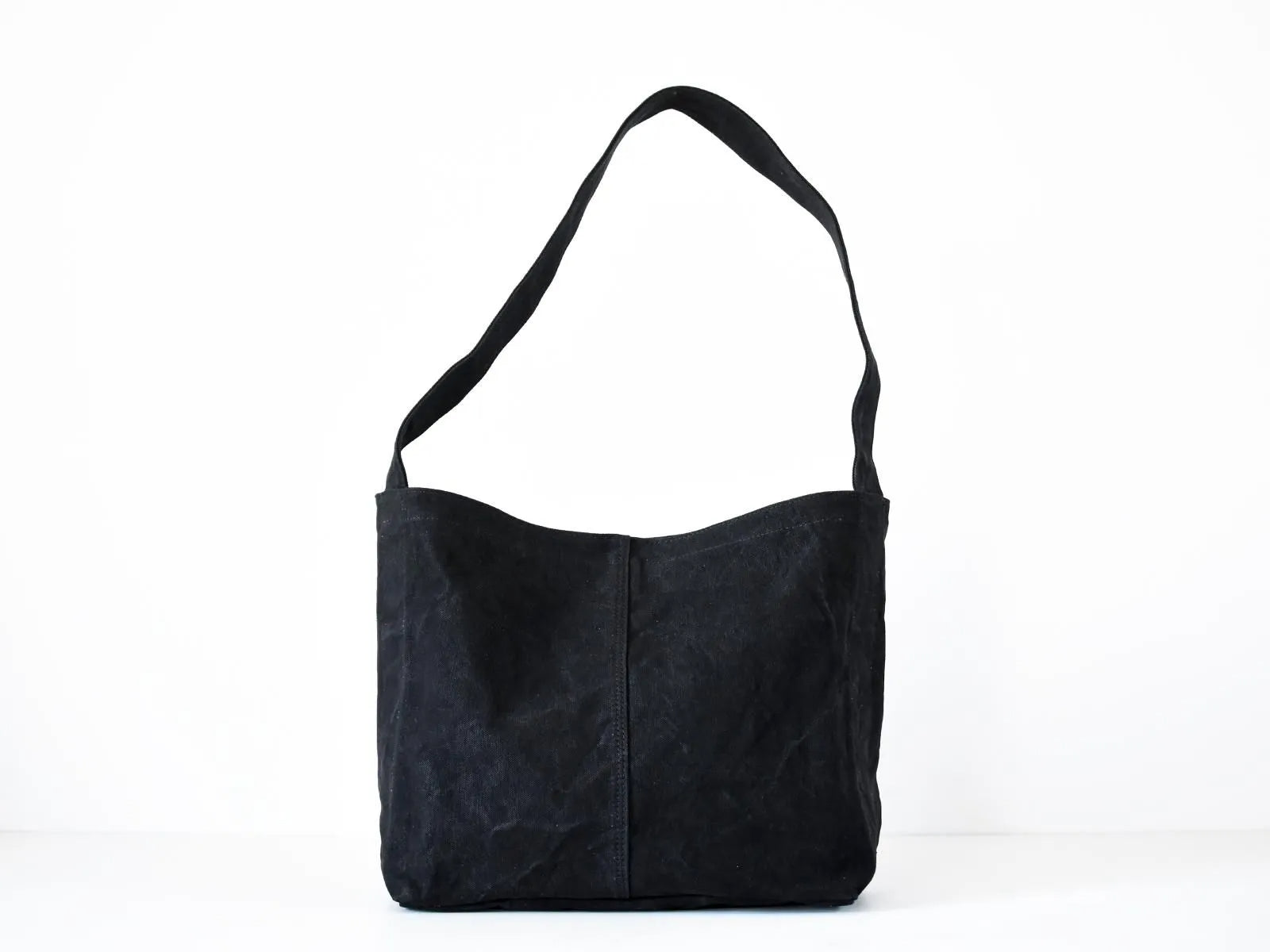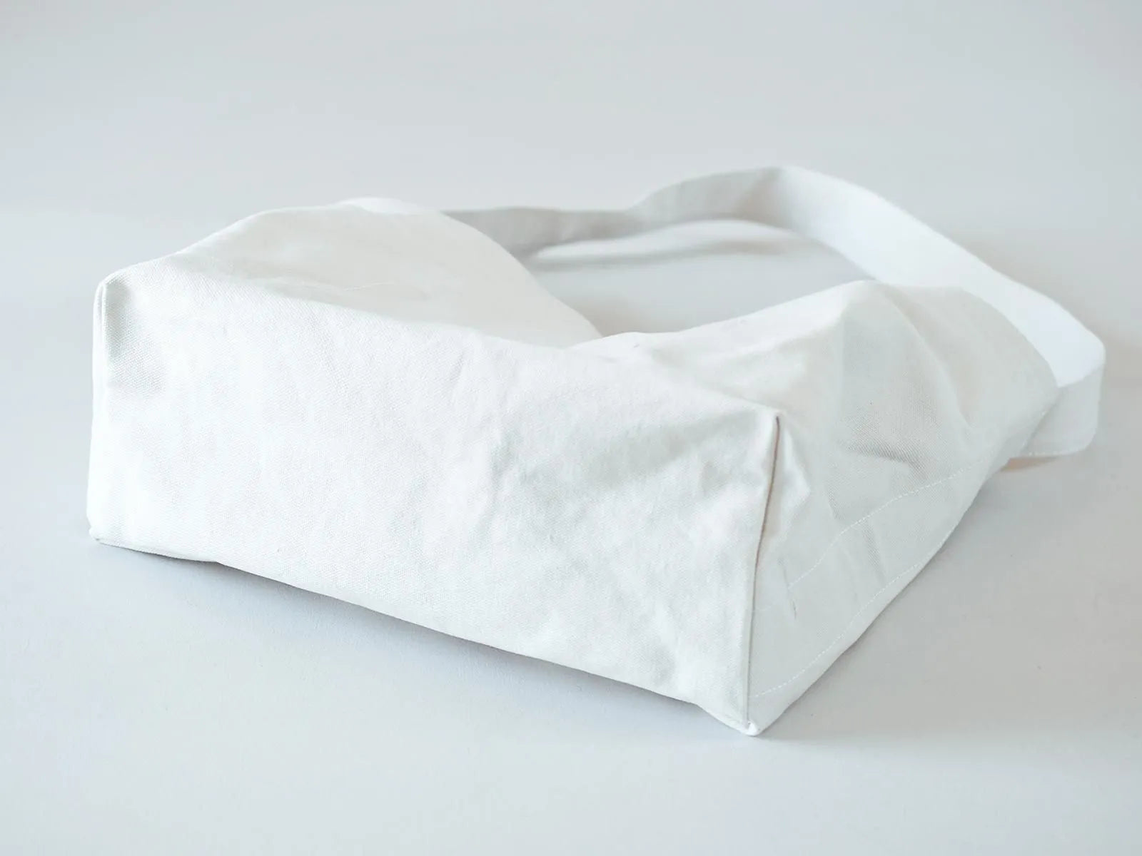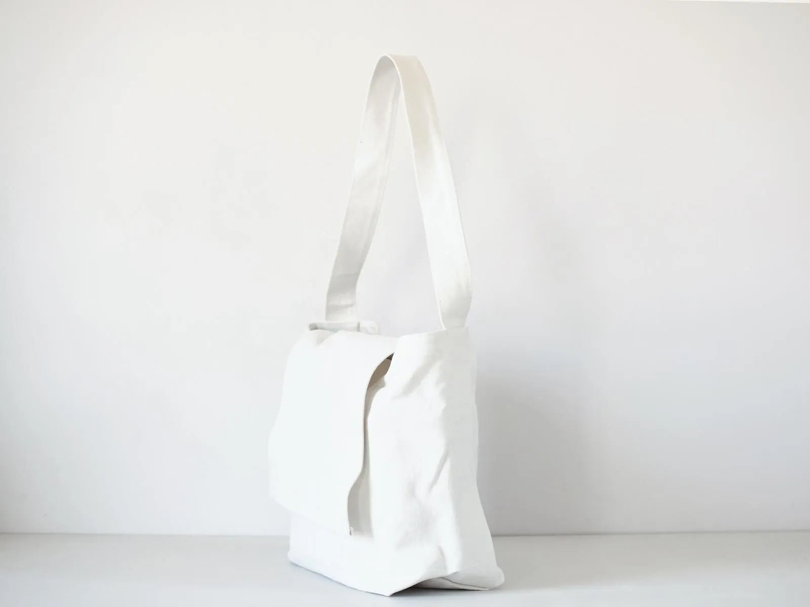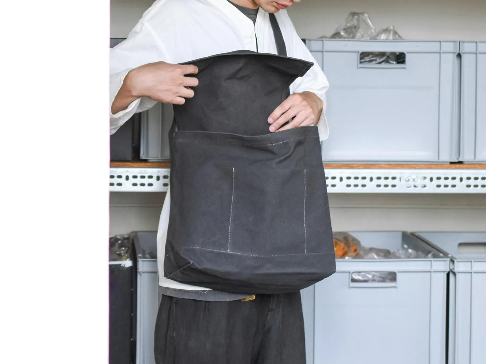 This large one-shoulder bag is crafted from durable No. 6 canvas (bio-washed) and is ideal for carrying a laptop, documents, and other items. The shoulder strap and divider pocket are attached to the inside, with the stitching intentionally exposed on the outside. The cover can be tucked inside or pulled out as a flap, allowing you to enjoy using it however you like.