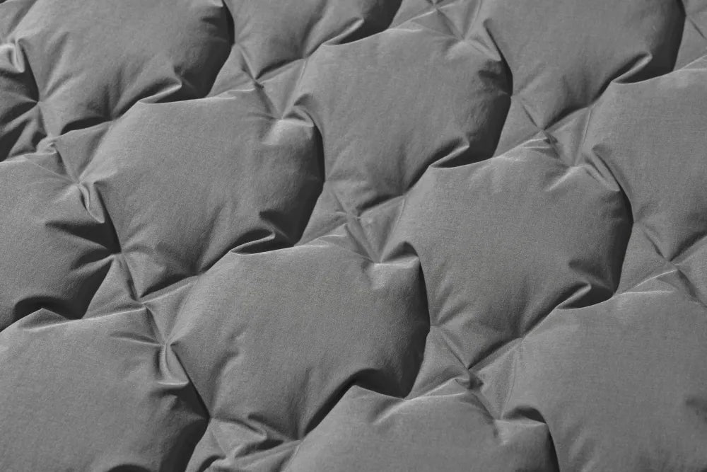 With previous so-called pressed down jackets, as the jacket deteriorates over time, the pressed parts burst, trapping the down there, making it unwearable. However, this technology eliminates this problem because the down is held in place by the weave.