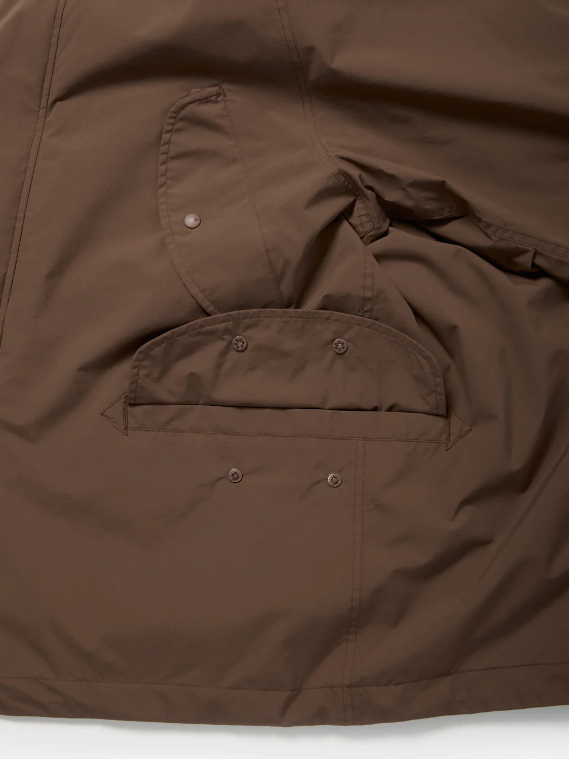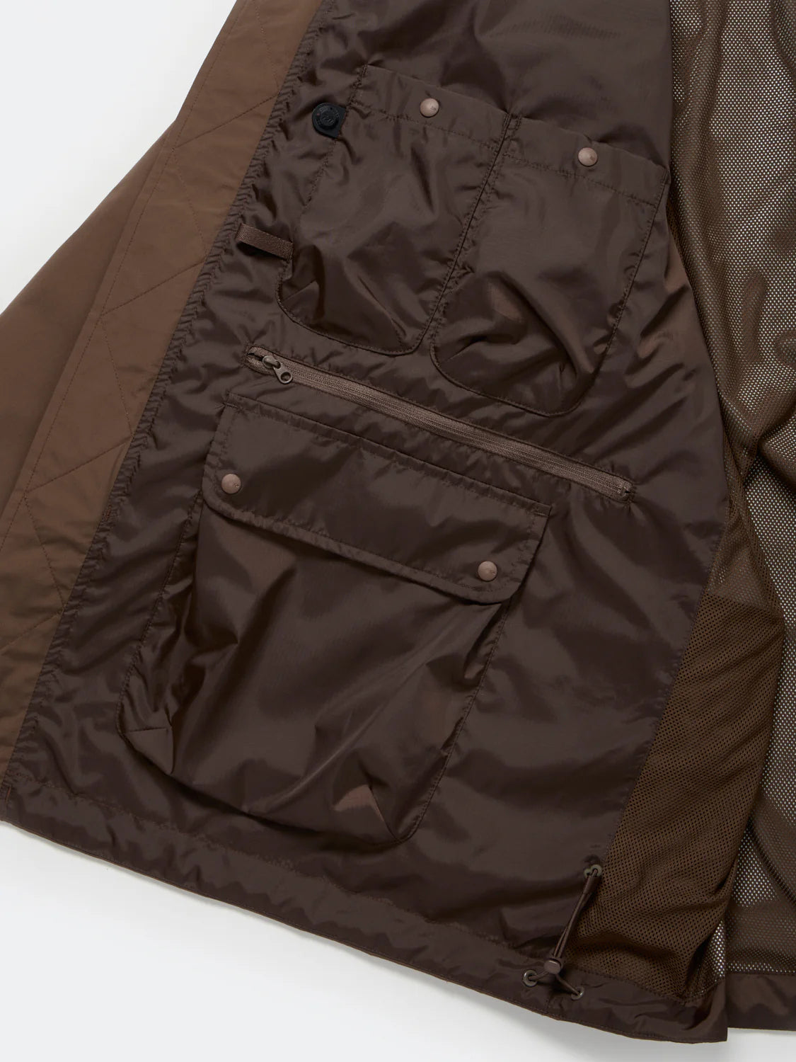 Based on a flight jacket design, this jacket has been updated for spring and summer wear. It retains the windproof placket and flap hand warmers, while also featuring large flap pockets running from the front to the sides. Various pockets of various sizes on the inside provide more storage space than meets the eye. The forward-flared sleeves, a distinctive military detail, add a design accent. Action pleats have been added, allowing for adjustable cuffs. This design expands arm movement and eliminates bulk at the cuffs. The mesh lining provides a comfortable, non-sticky feel.