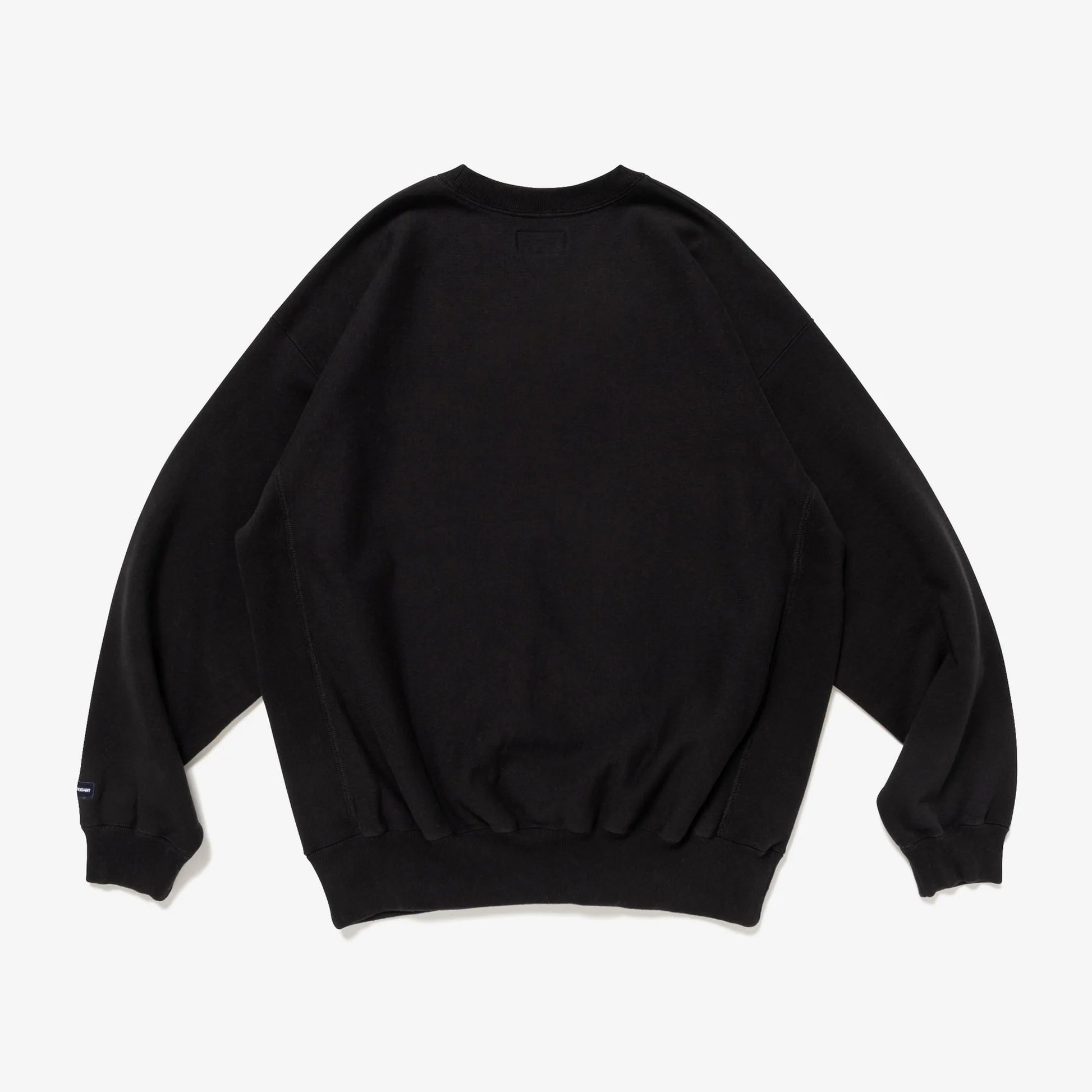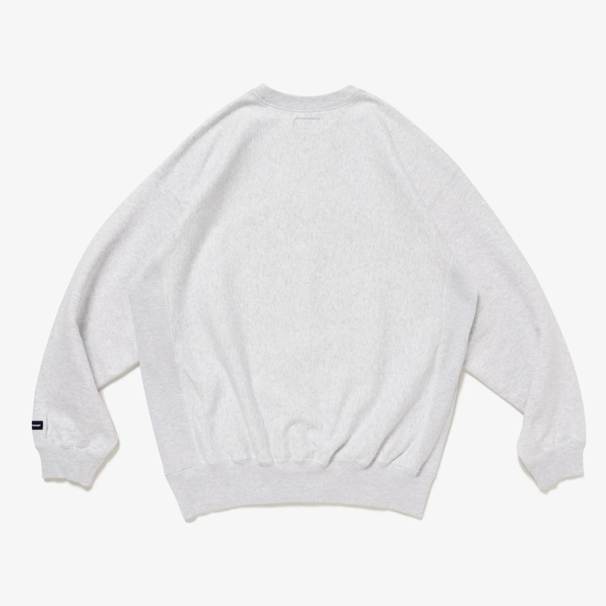This crew neck sweatshirt is made from thick cotton fleece, with the grain running horizontally across the body and ribbing along the sides. It features a satin patch sewn onto the front, a relaxed fit with a tapered hem, and original tape piping along the neckline. The left cuff features an embroidered box logo.