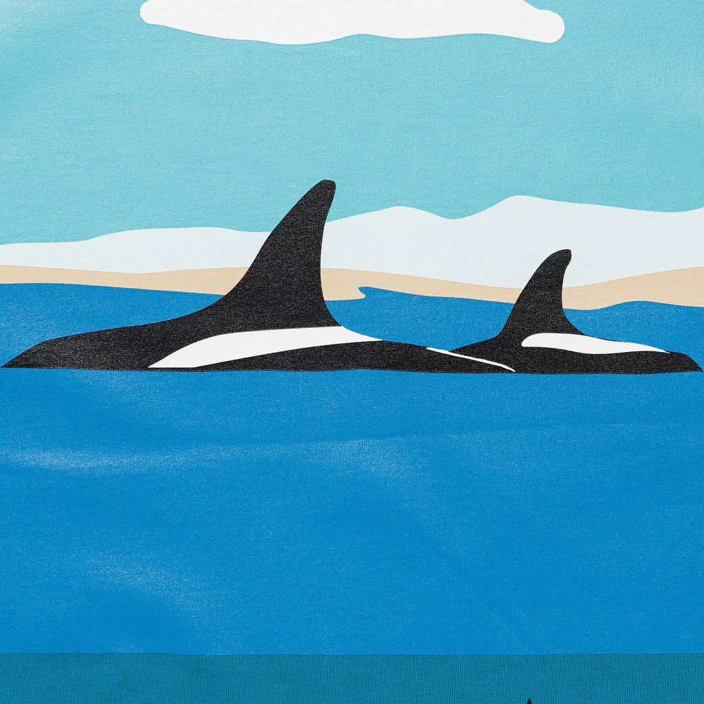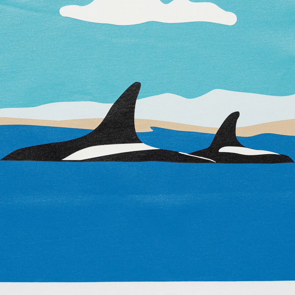This short-sleeved T-shirt features an organic cotton jersey body and features a graphic of a killer whale swimming in the ocean and the SHIP logo. It has a relaxed silhouette and features a SHIP logo printed on the left chest. The neckline is piped with original tape. A woven CETUS label with the size displayed is attached to the right front hem.
