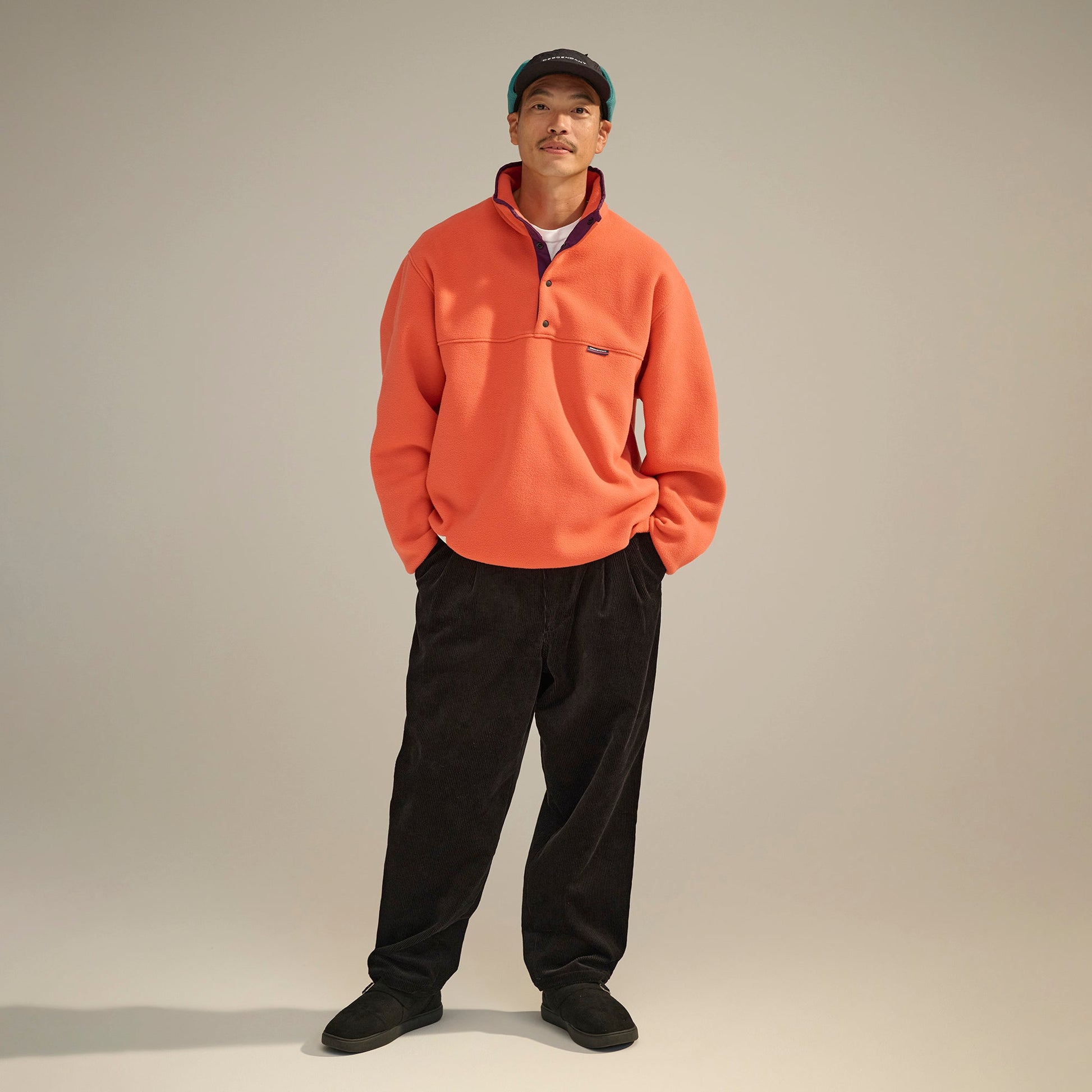 A HUMMING fleece pullover with a half placket and dot button closure, made from fleece with excellent heat retention. A loose silhouette. Piping is applied to the cuffs and hem. Woven HORIZON logo on the back of the stand-up collar. Original tape piping on the neckline seam. Woven CETUS label on the right front hem.