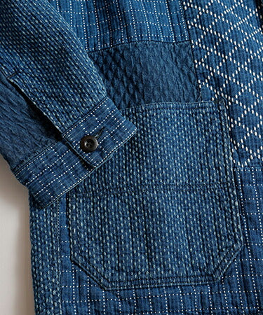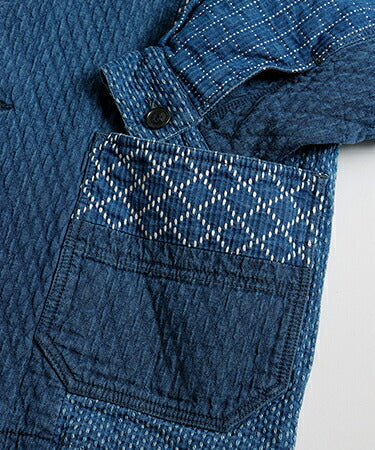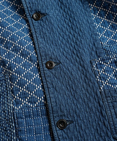 A tailored jacket-style outerwear made of indigo material with various weaves.