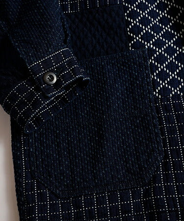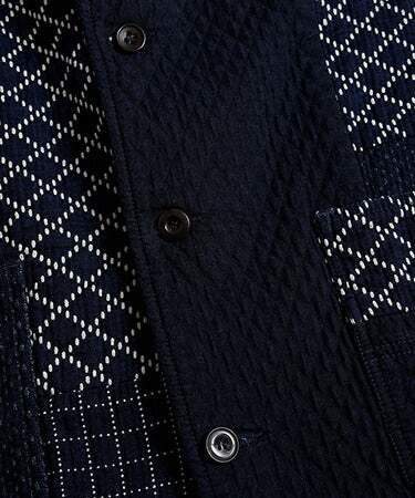A tailored jacket-style outerwear made of indigo material with various weaves.