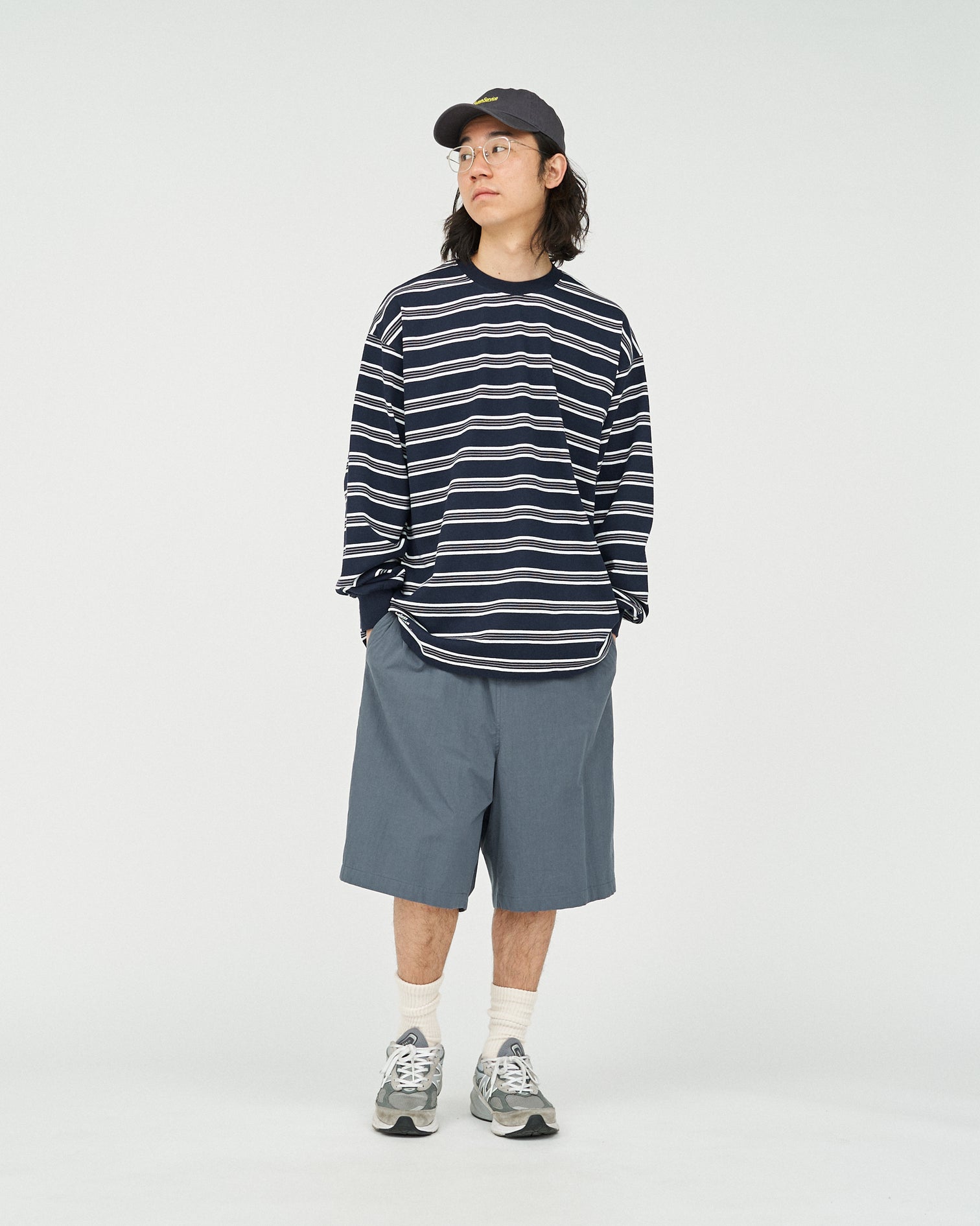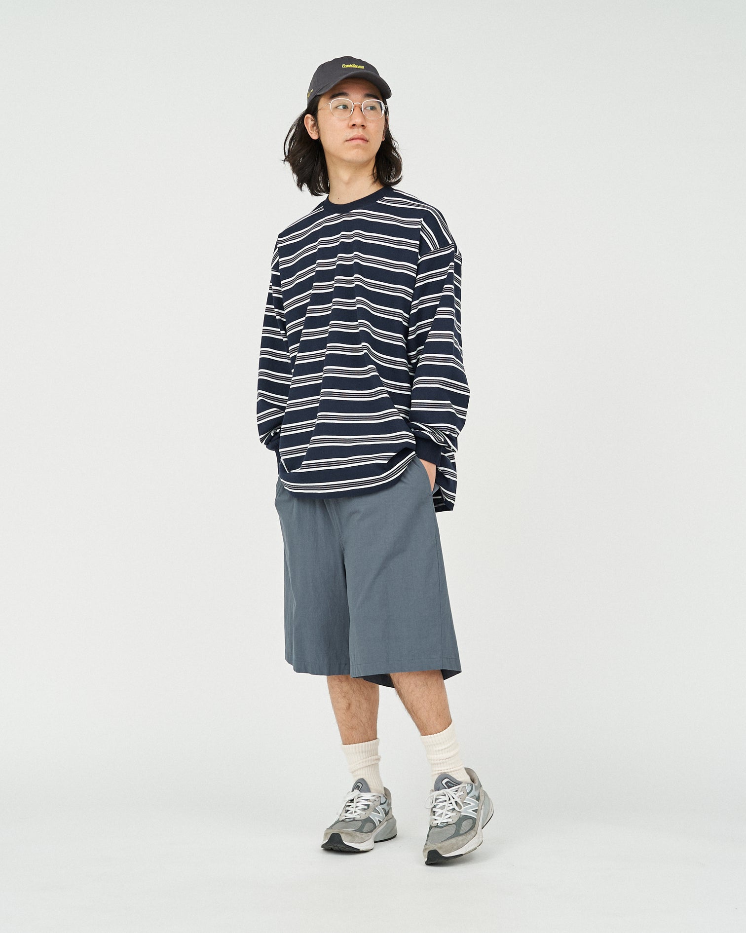 These climbing shorts feature a belt with a logo on the tip. The material is cotton poplin, which is very light and has a unique wrinkled texture that is resistant to dirt and friction. The lining is made of mesh, which makes it comfortable against the skin. The waist is decorated with a neon yellow loop that is typical of FreshService. The faded texture of the washed fabric gives this pair of shorts a sophisticated look.