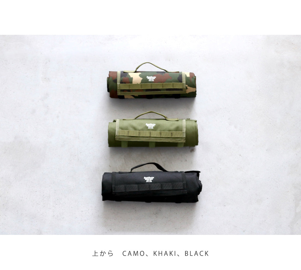 Leisure sheet for use in a variety of situations, from camping to picnics. Made of light, flexible and durable nylon material, with PVC coating on the reverse side to prevent water ingress from the ground. It can be rolled up for compact storage and has a handle for easy carrying. The cover is decorated with a braid that can be conveniently used to attach small items.