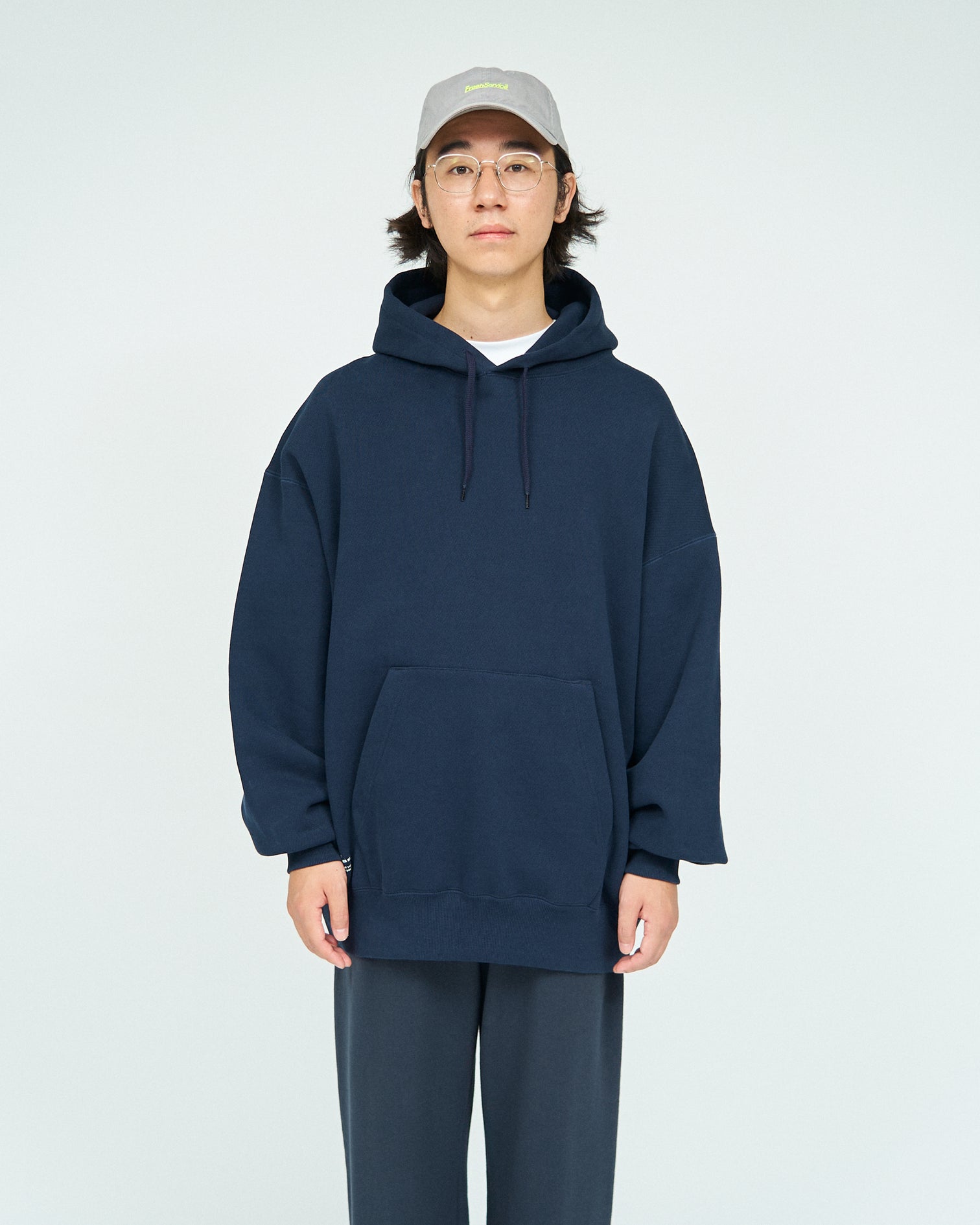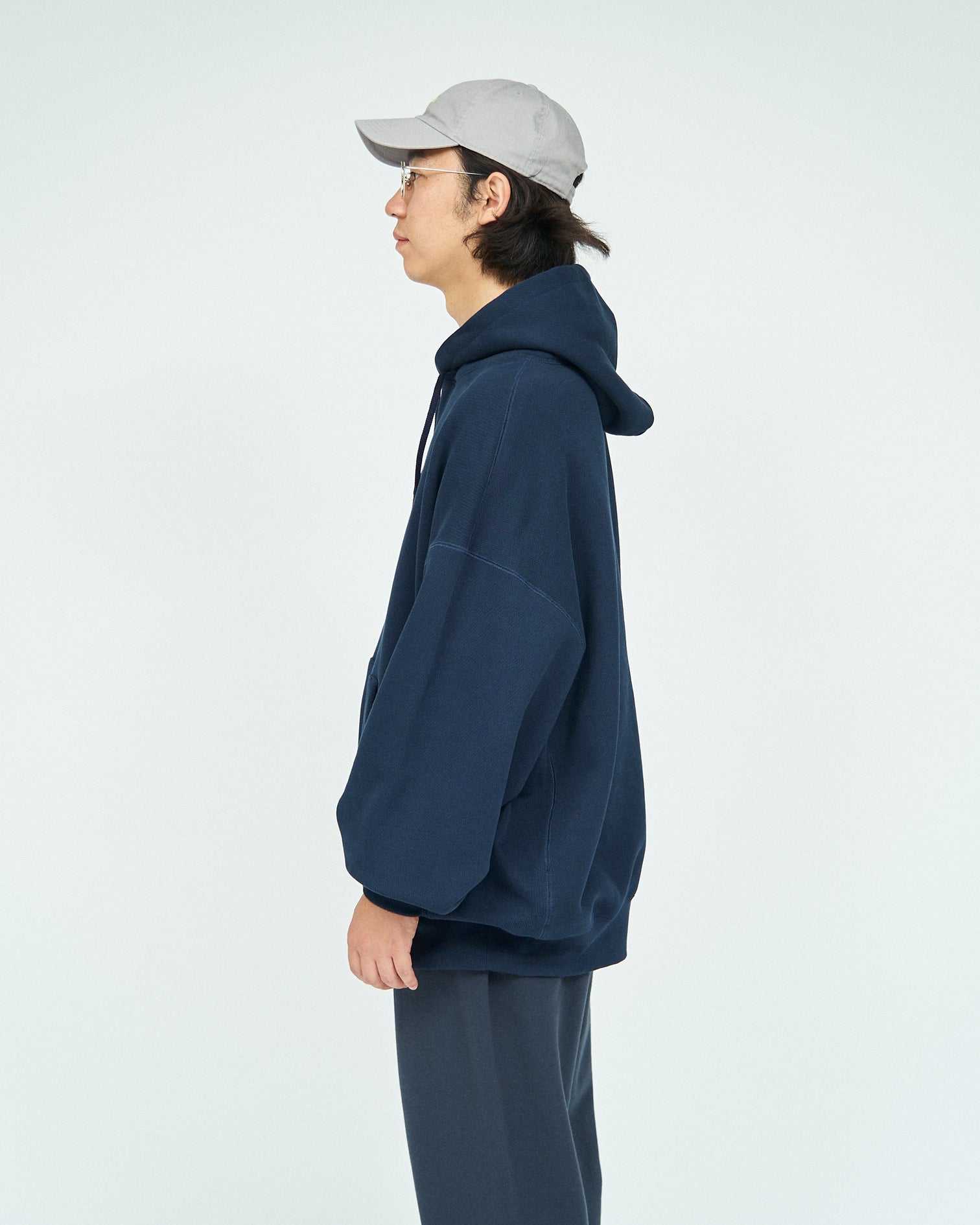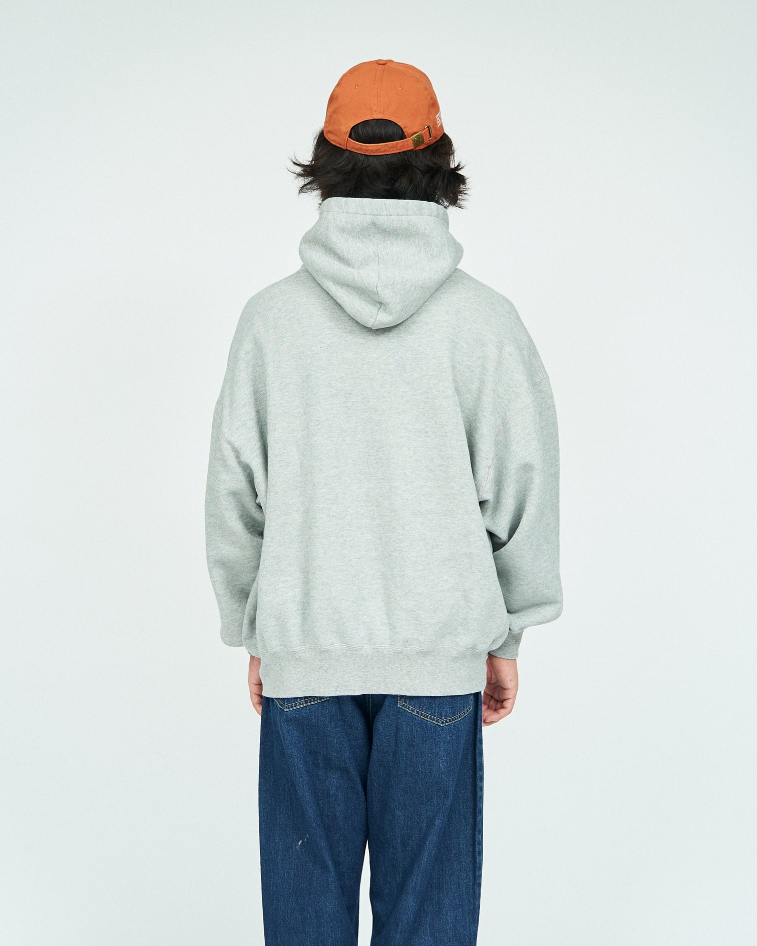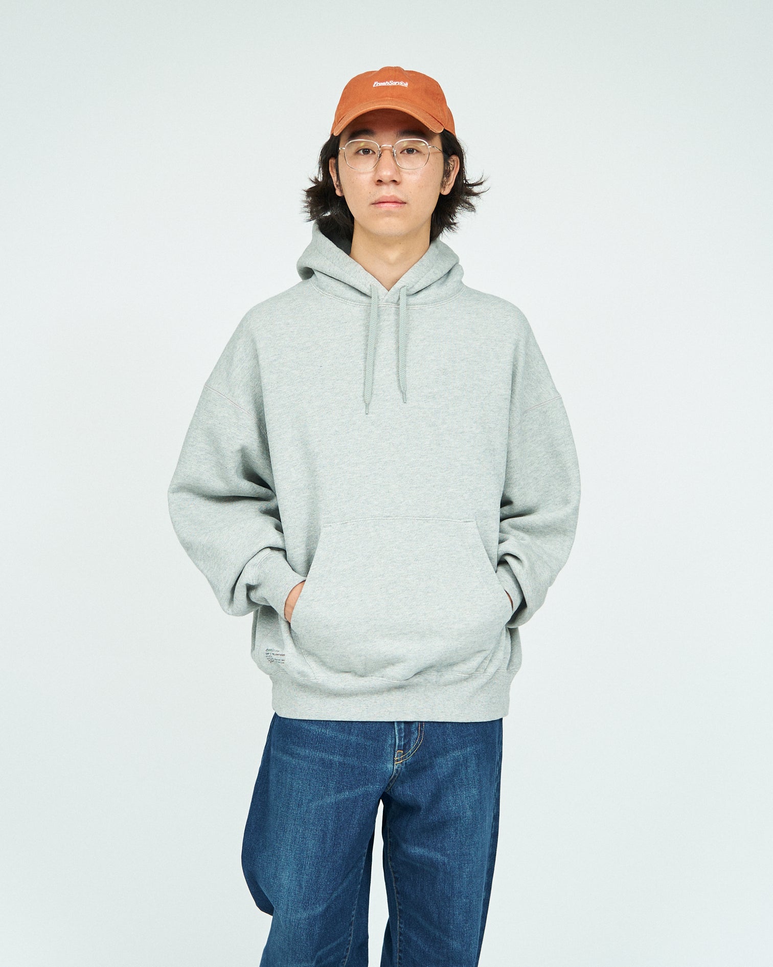 A pullover hoodie with a firm and tough texture. The body is made of thick fleece material that has a clean look but is tightly woven. This top has a loose fit from the body to the arms, typical of FreshServe, and can be worn on its own.