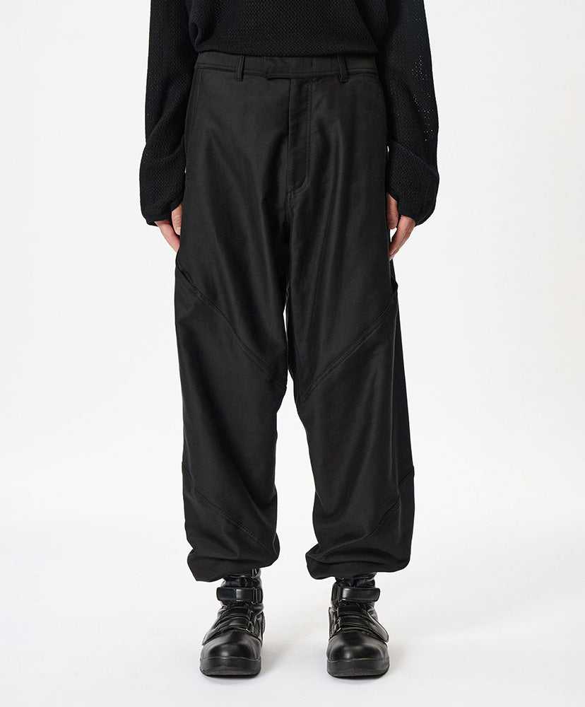 These wide-leg pants feature a three-dimensional spiral construction. Crafted from cotton-silk moleskin, they boast a beautiful sheen and a soft feel. The crisp texture creates a distinctive silhouette.