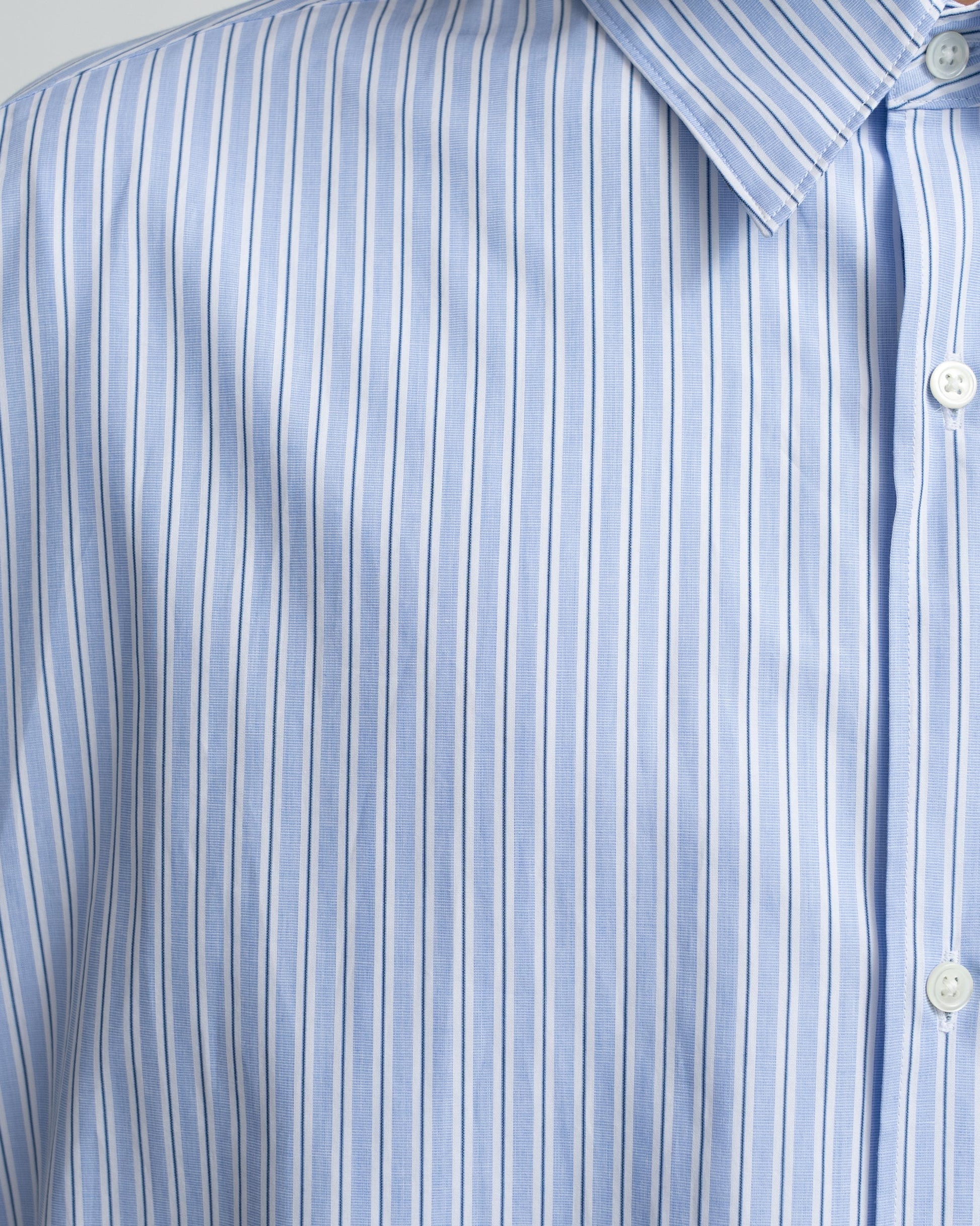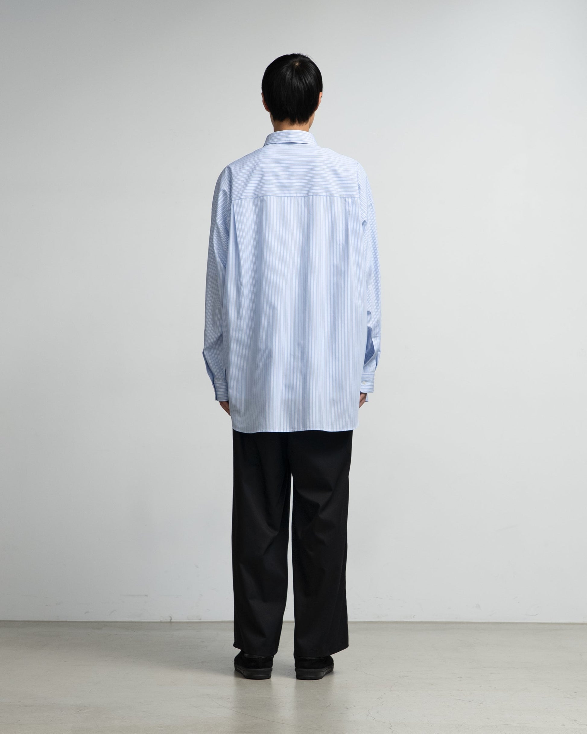 An oversized shirt made of broadcloth using fine, delicate cotton from SIDOGRAS, a company based in Barcelona, Spain. The vibrant dyeing, the sheen of the material itself, the moderate firmness, and the soft feel are also attractive. It has a voluminous box silhouette with dropped shoulders and an authentic regular collar. The big silhouette is finished with a unique balance of small details such as the slope of the shoulders, the low yoke position, and the wide armholes.