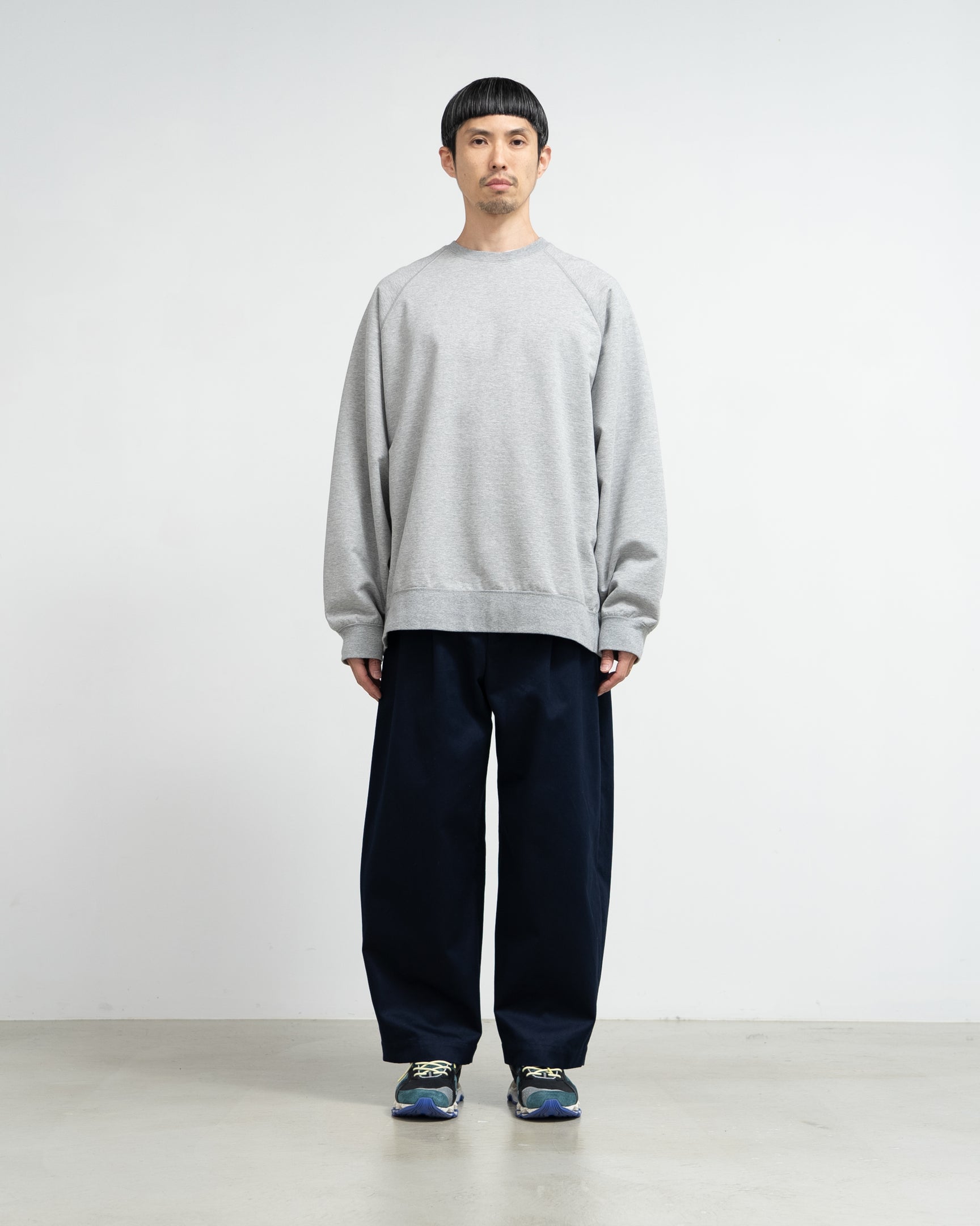 Compact terry with a tightly woven, flat look. This season, the gauge has been increased to the maximum to maintain the original firmness while pursuing a more beautiful texture and loop feel. In order to take advantage of the material and knitting machine, no post-processing is done and the garment is left natural. The oversized body width and arms combine with the firmness of the fabric to create a fuller silhouette. Flat seam stitching creates a flat finish.