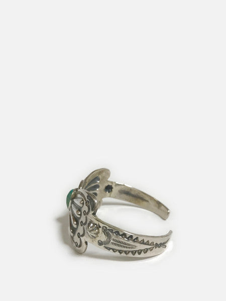 A sheet of silver is cut off in the shape of a butterfly, and the butterfly and shell points are hammered out strongly from behind by hammer work, a traditional technique of Indian jewelry, and the surrounding area is finished by stamp work. Just by putting one on your wrist, it will give off an enormous impact. One size fits all, so please adjust it to fit your wrist.
