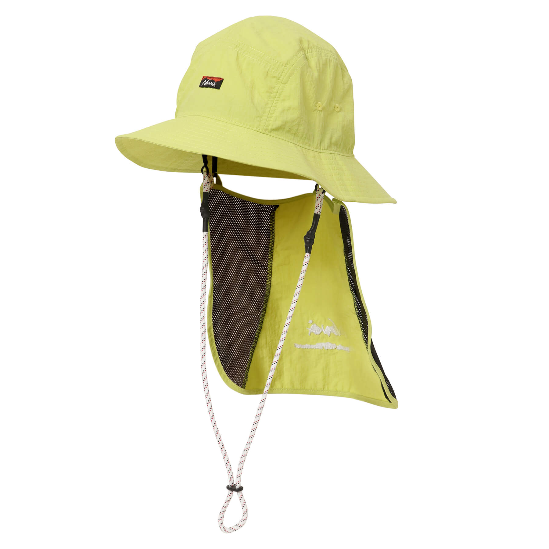 Sunshade hat made of nylon tassar material. The brim (brim) length of the front and the bag is adjustable and the bag is longer. The sunshade cloth, which also serves to prevent sunburn on the nape of the neck, is removable and can be worn as desired.