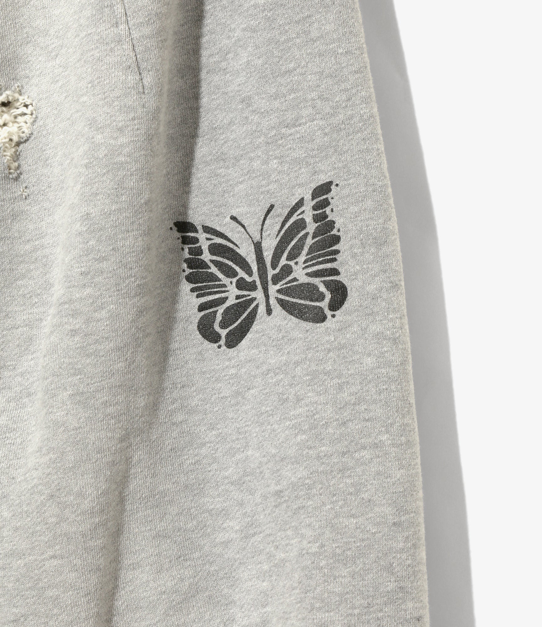 These sweatpants, featuring realistic distressing and fading reminiscent of vintage sweatshirts, are released in NEEDLES' popular H.D. pant style. The design incorporates darts to create a three-dimensional silhouette, and the butterfly print stands out, making this a truly unique piece.