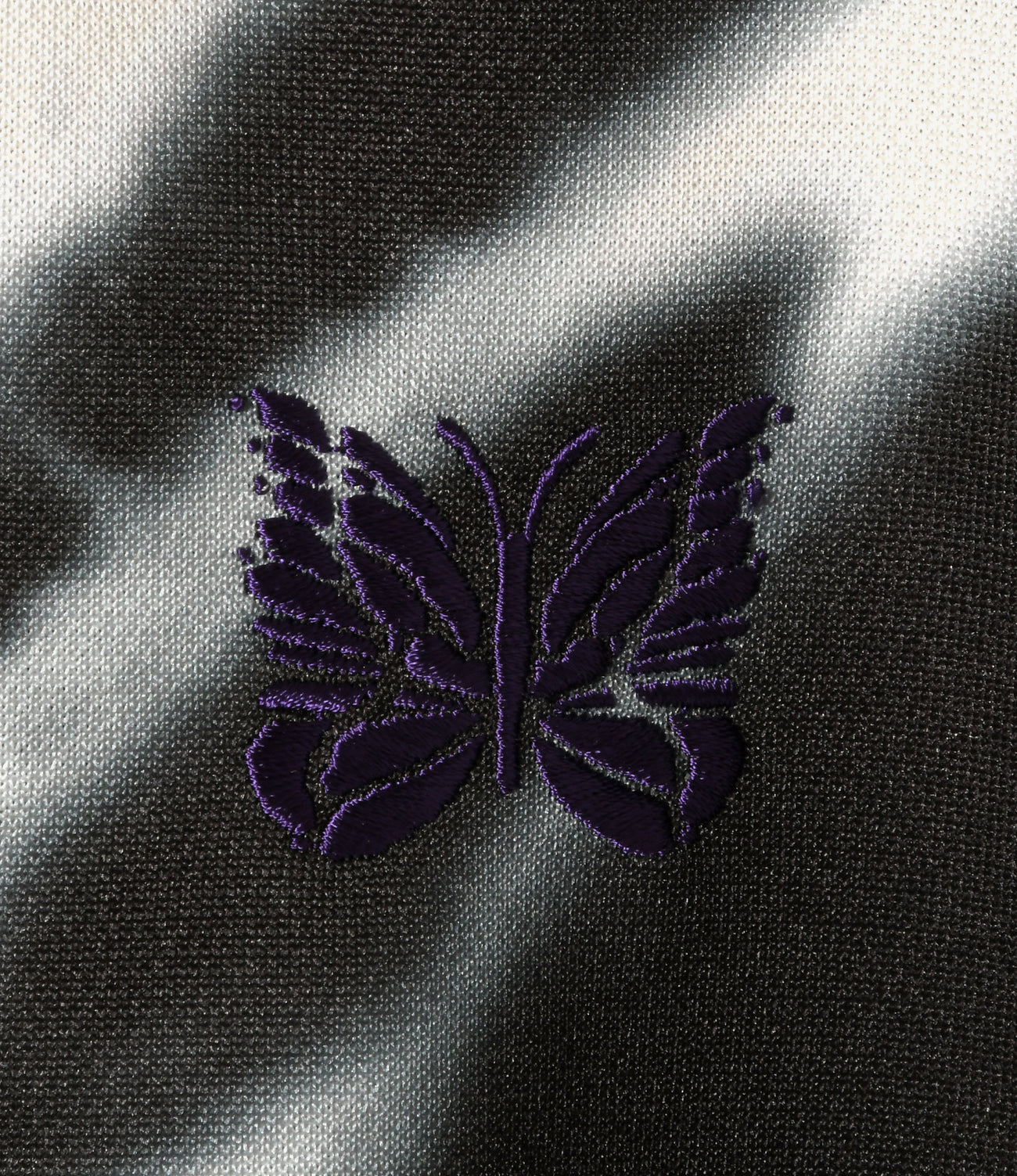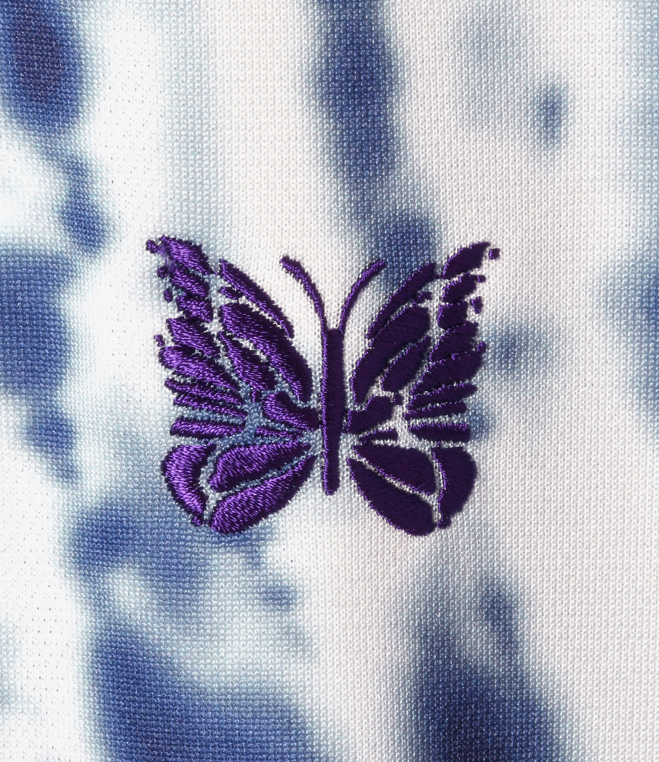 The TRACK CREW NECK SHIRT, a staple item of NEEDLES, features a bold tie-dye pattern printed on the body. The five-line tape with a rough knit and the embroidered papillon pattern are also present. The unique print on the smooth polyester material gives it a different look than usual, making it a stylish piece.