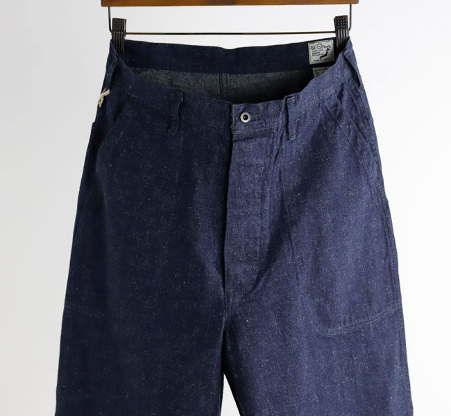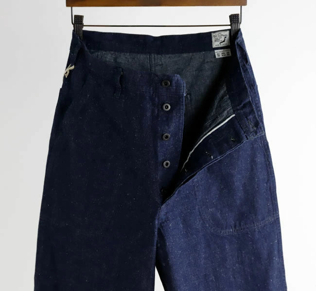 The WIDE FIT US NAVY UTILITY PANTS are a derivative of the classic US NAVY UTILITY PANTS. Inspired by the actual work denim pants that existed during World War II in the 1940s, these pants faithfully recreate the wide silhouette of that era. The orslow original 9oz selvedge denim is designed and woven based on vintage denim from that period. The fabric has a rough texture and is characterized by its unique slubby feel.