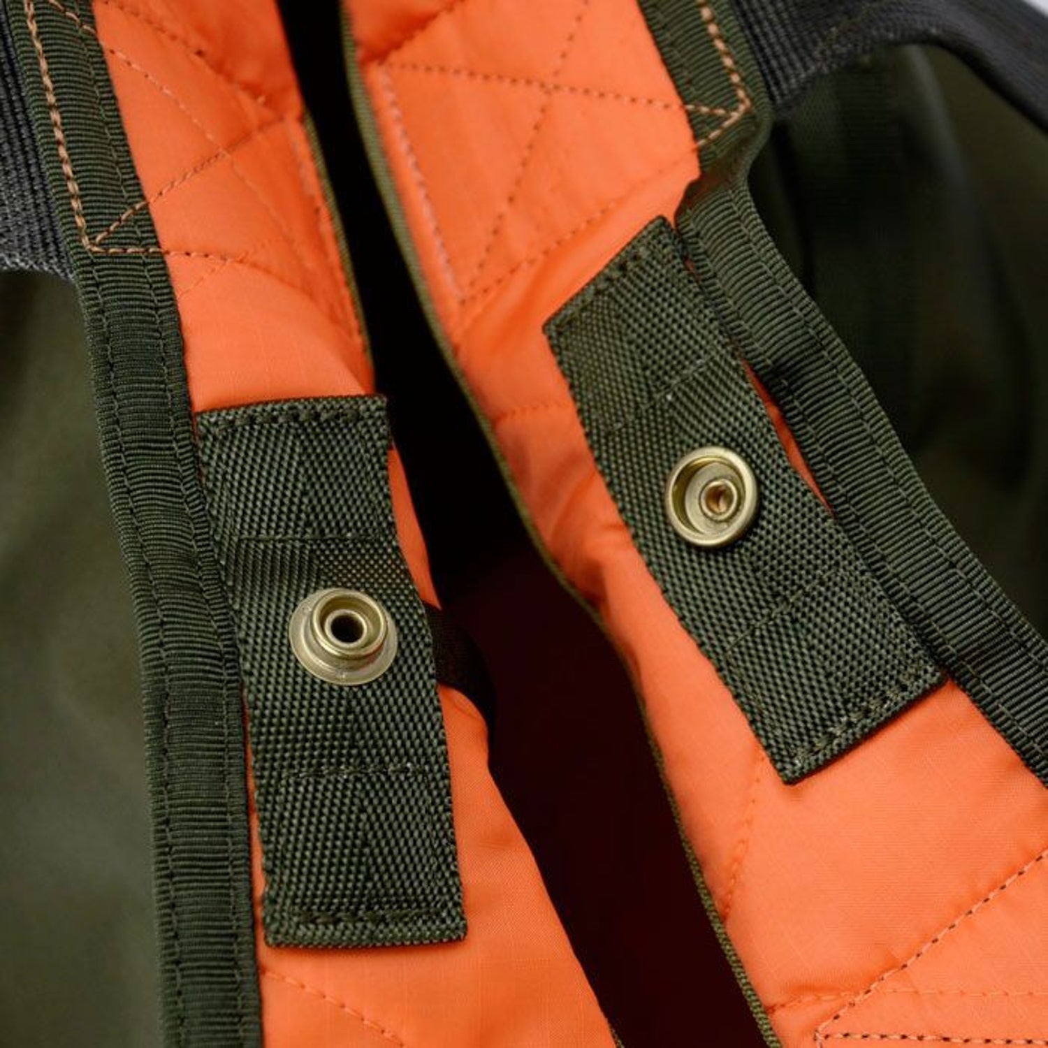 Inspired by the lining of a military jacket, the emergency color orange is used for the interior, and ripstop nylon is quilted. Up to 4 different types (4 colors) of nylon tape are used in key points to create a realistic military feel. Except for some items, the interior pocket is removable and can be used as a single pouch.