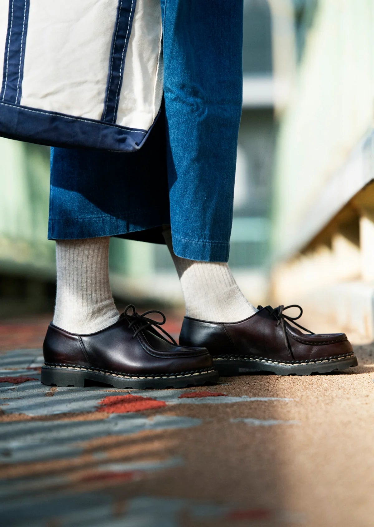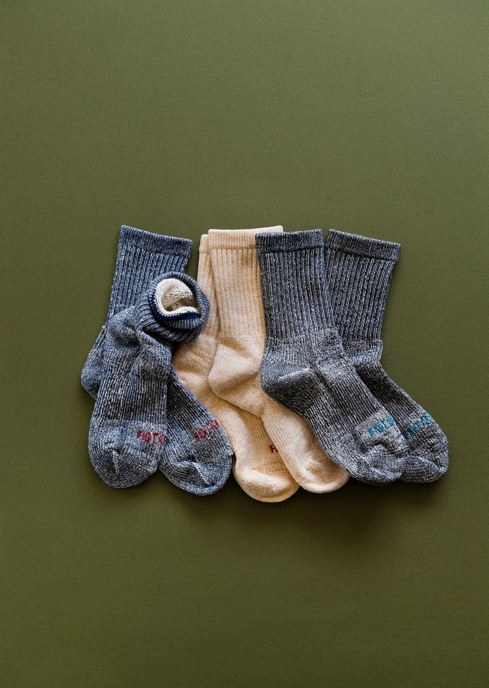 This model is the updated version of R1380 DOUBLE FACE MID SOCKS “ORGANIC COTTON” and comes with the same comfort and slightly longer legs for year-round use. The adequately thick double-layered fabric is made of organic cotton on the both sides. The gently-brushed undyed organic cotton lining and soft elastic yarn used around the cuff as well as arch support feel comfortable and relaxing.