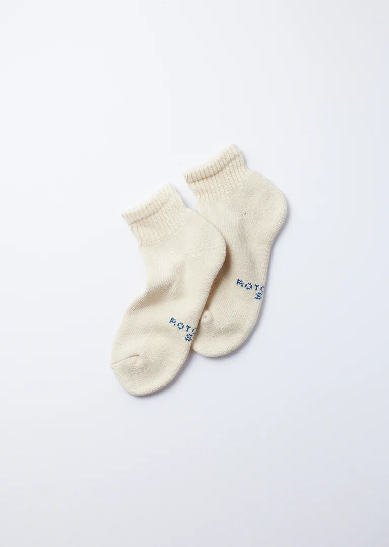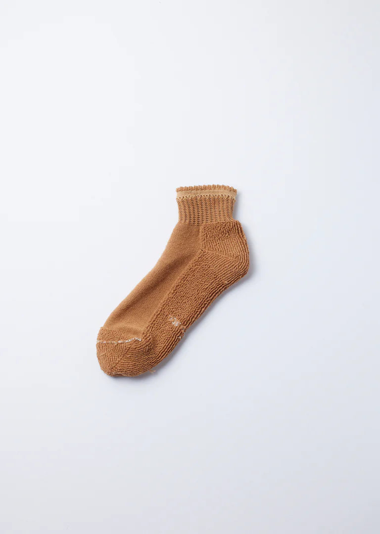 A pack of three pairs of undyed organic cotton ankle socks with a soft brushed sole. Each pair naturally fits into your wardrobe regardless of season and occasion. Knitted with naturally colored cotton (Chamen), the brown pairs are undyed, let alone the ecru one. The gray color is created also not by dyeing but by causing a chemical reaction on rare pale green cotton (Midorimen), while applying a plant dying method called mordanting to fix the color. The color was born as a by-product of a study to prevent Midorimen cotton from color fading by sunlight because the material inherently has low color fastness to light.