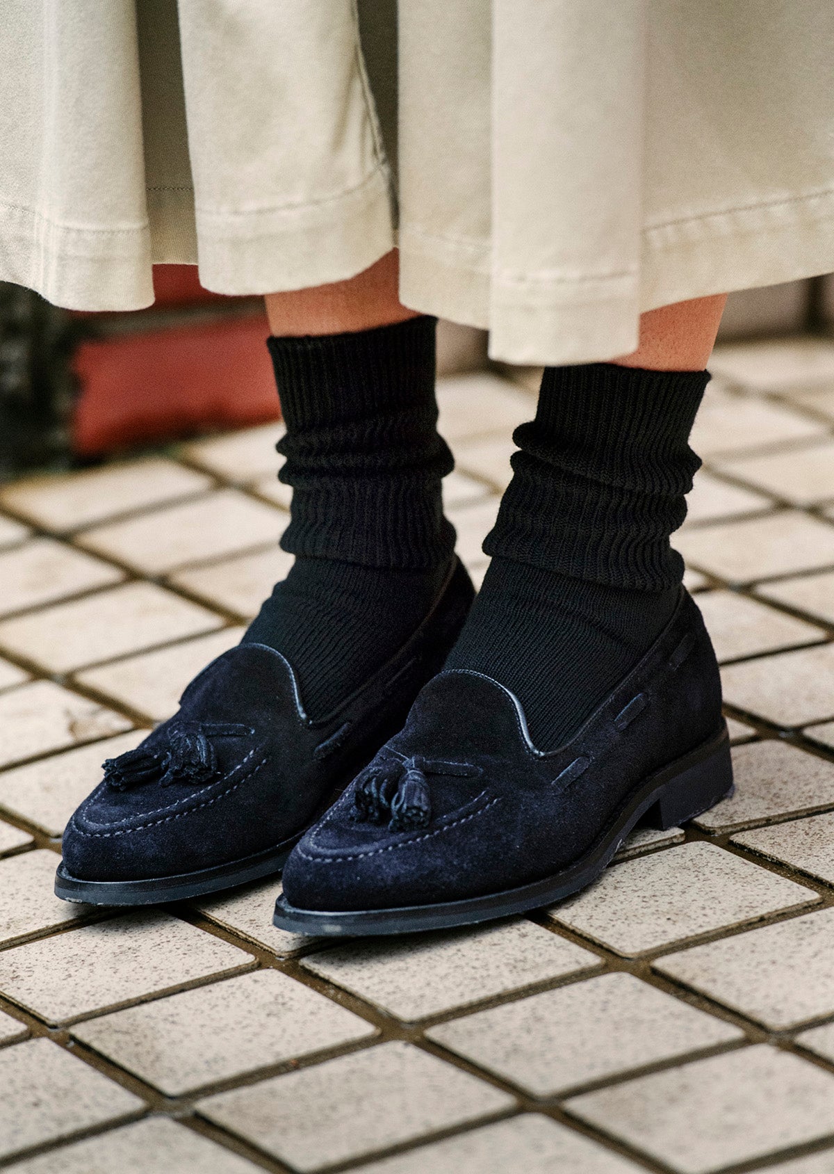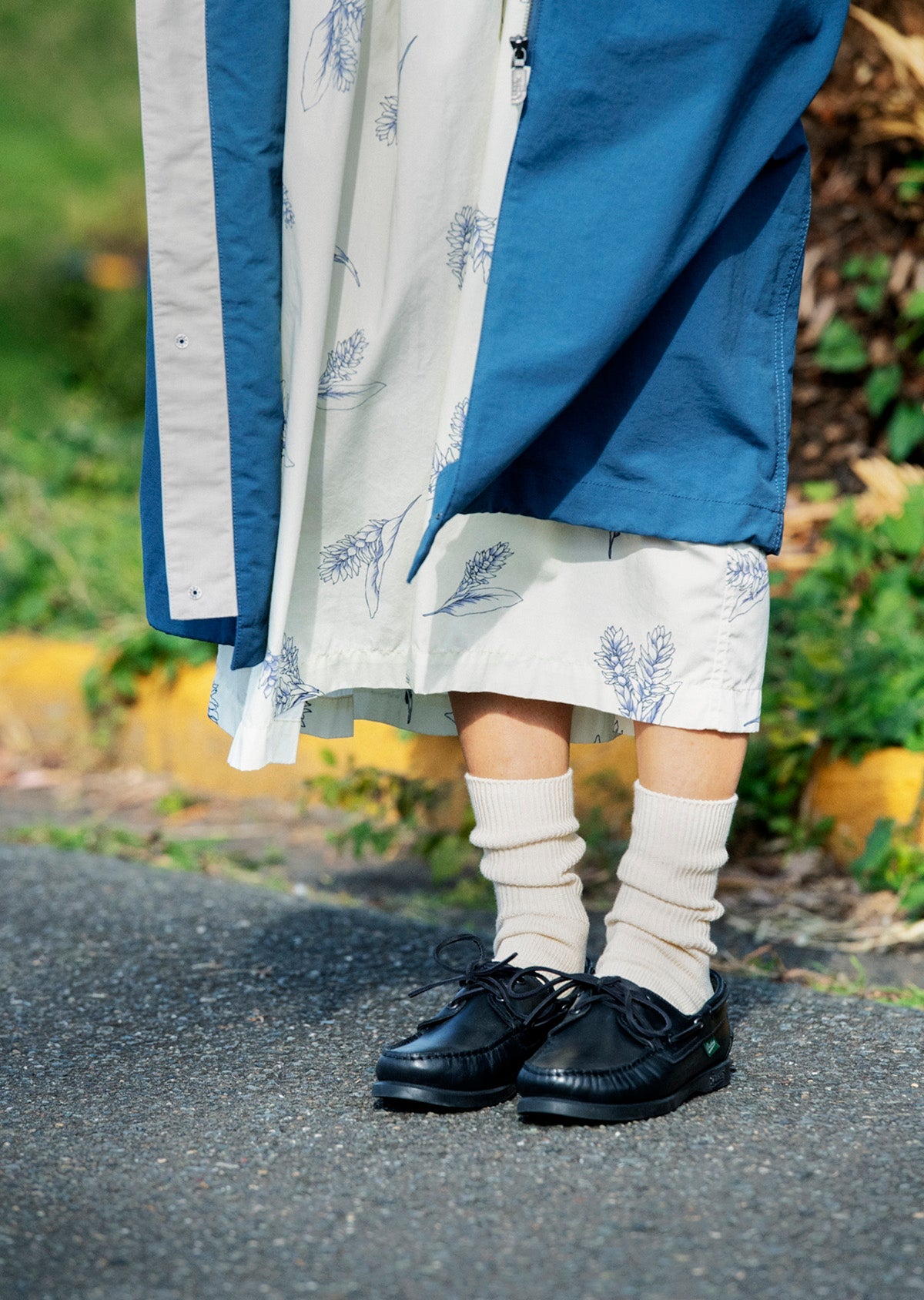 This combo pack includes three pairs of simply designed socks made of undyed organic cotton. The leg of each sock is 1x1 rib knitted for soft stretch, while the foot is jersey knitted for less stretch to avoid the item to be crumpled in leather shoes. Knitted with naturally colored cotton (Chamen), the brown pairs are undyed, let alone the ecru one. The gray color is created also not by dyeing but by causing a chemical reaction on rare pale green cotton (Midorimen), while applying a plant dying method called mordanting to fix the color. The color was born as a by-product of a study to prevent Midorimen cotton from color fading by sunlight because the material inherently has low color fastness to light.
