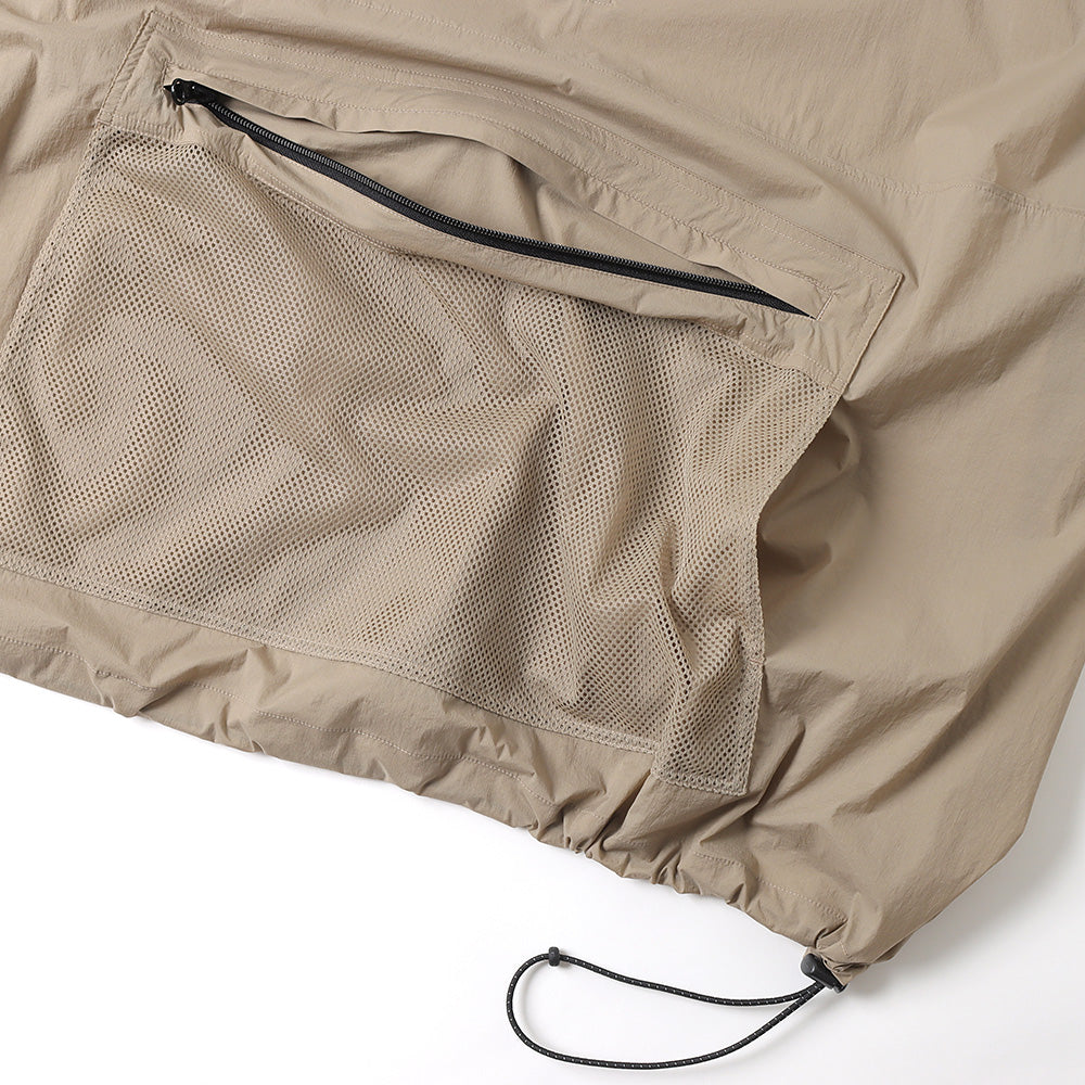 HALF ZIP CREW SHIRT features a wide silhouette with a large mesh pocket on the front. A drawcord is attached to the hem, so you can arrange the silhouette. The material is 20D nylon, which is ultra-lightweight, highly water-repellent, and has high stretch fabric. Although it uses thin threads, it has a high density, so it is a material that has a unique firmness and high-quality appearance.
